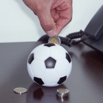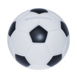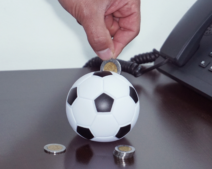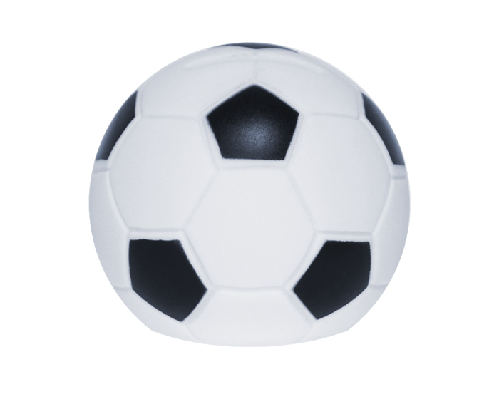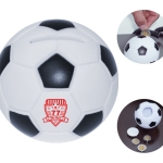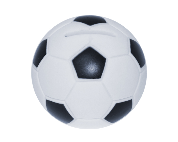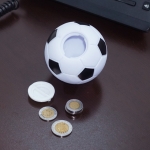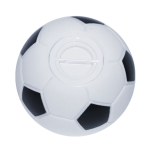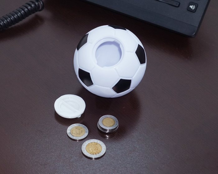 Alcancía de plástico en forma de balón de fútbol soccer. Cuenta con tapa giratoria en la parte inferior para poder abrir.