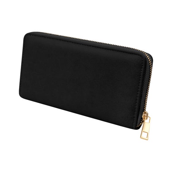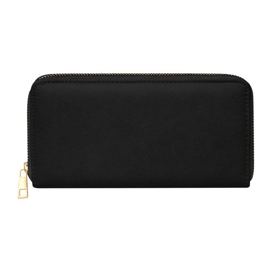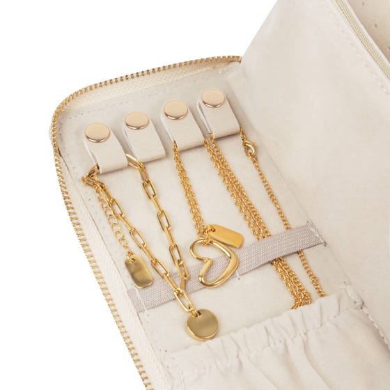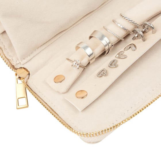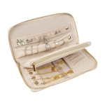 Organizador de joyería para viaje con diseño tipo cartera. Cuenta con múltiples compartimentos internos para organizar anillos, aretes, collares y pulseras, incluyendo ganchos metálicos, bolsillo con cierre y bandas con broches. Cierre completo y formato compacto para llevarlo en bolsa o maleta sin ocupar mucho espacio.