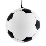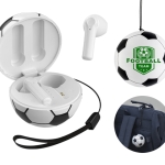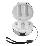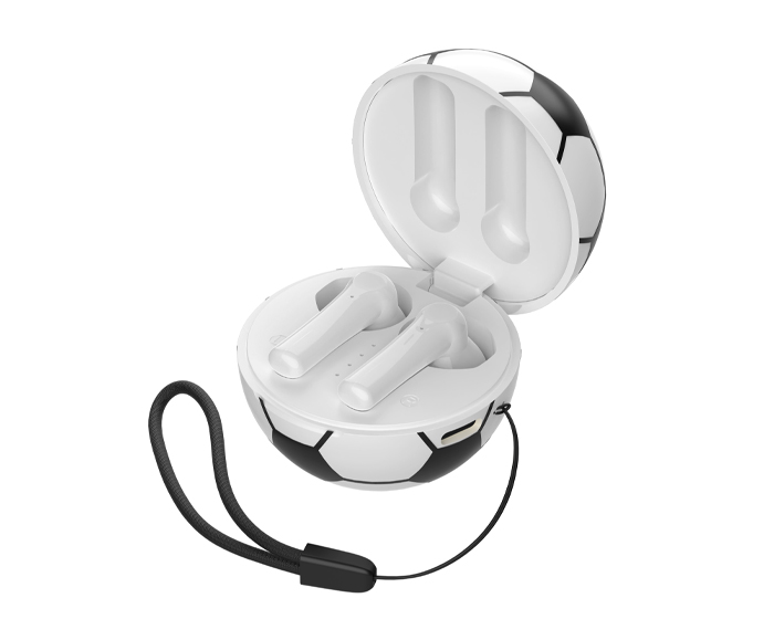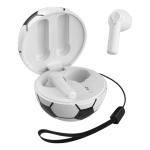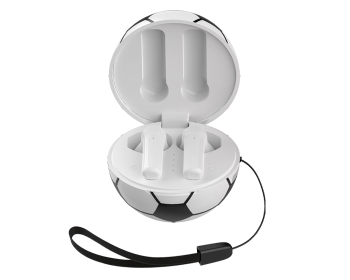 Audífonos inalámbricos Bluetooth con estuche de carga de 220 mAh en forma de balón de fútbol soccer. Cuentan con función de manos libres, alcance de hasta 10 m, entrada tipo C (incluye cable) y correa para transporte. Duración aprox. de reproducción de 4 hrs. Tiempo de carga 2 hrs. Compatibles con dispositivos Android e iOS. Presentación: Caja a color.