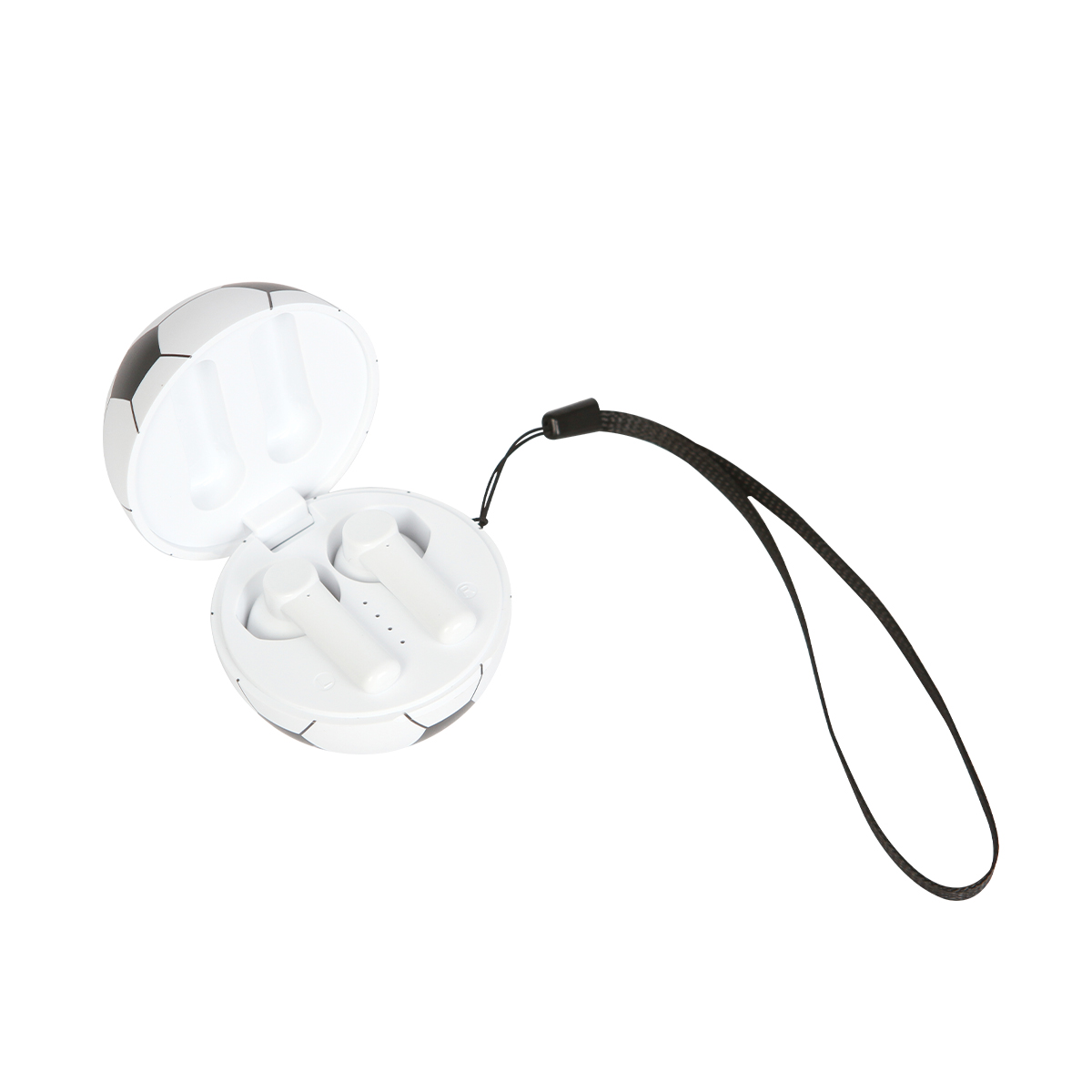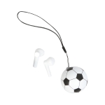 Estos audífonos inalámbricos con diseño compacto y divertido cuentan con un estuche que protege los componentes internos, e incorpora un espacio destinado para impresión, integrado de manera visible al diseño. La tapa del estuche se abre mediante un sistema abatible que permite acceder fácilmente a los audífonos. El conjunto mantiene un formato práctico y bien definido, con un diseño distintivo que combina funcionalidad y presentación, adecuado para el resguardo y transporte de los audífonos, gracias a su cordón integrado.