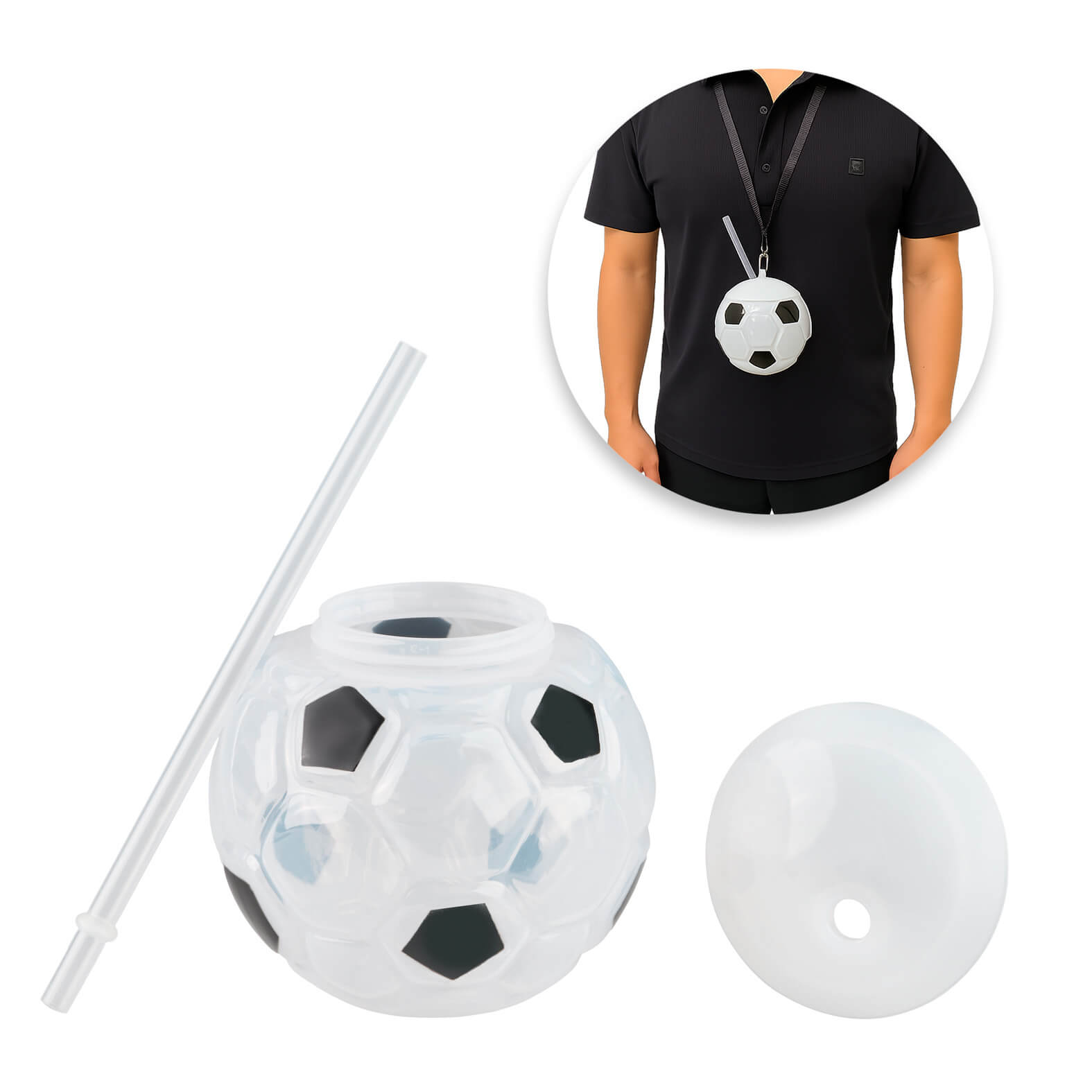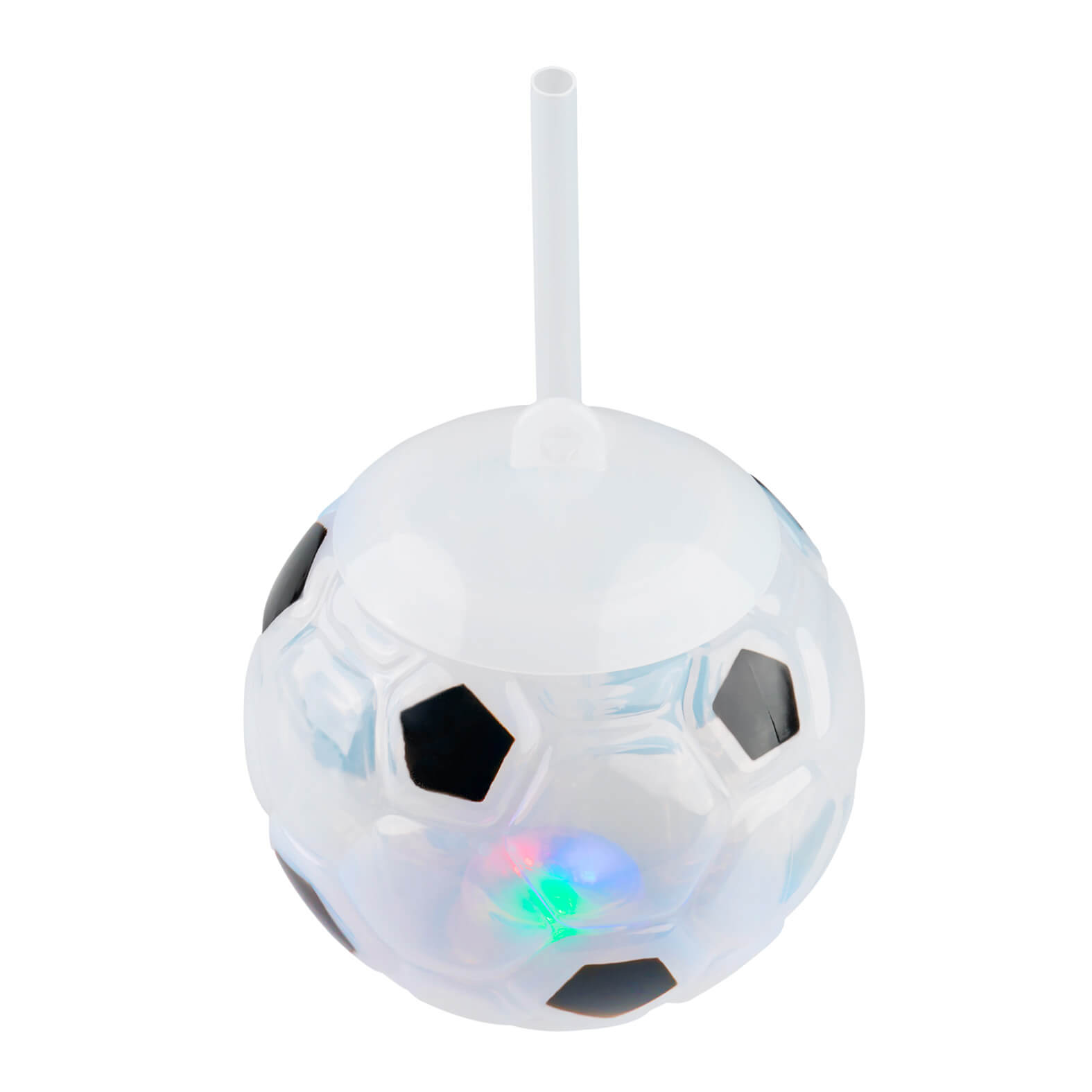Cilindro de plástico con forma de balón de soccer, listón, popote y luz de 3 colores.