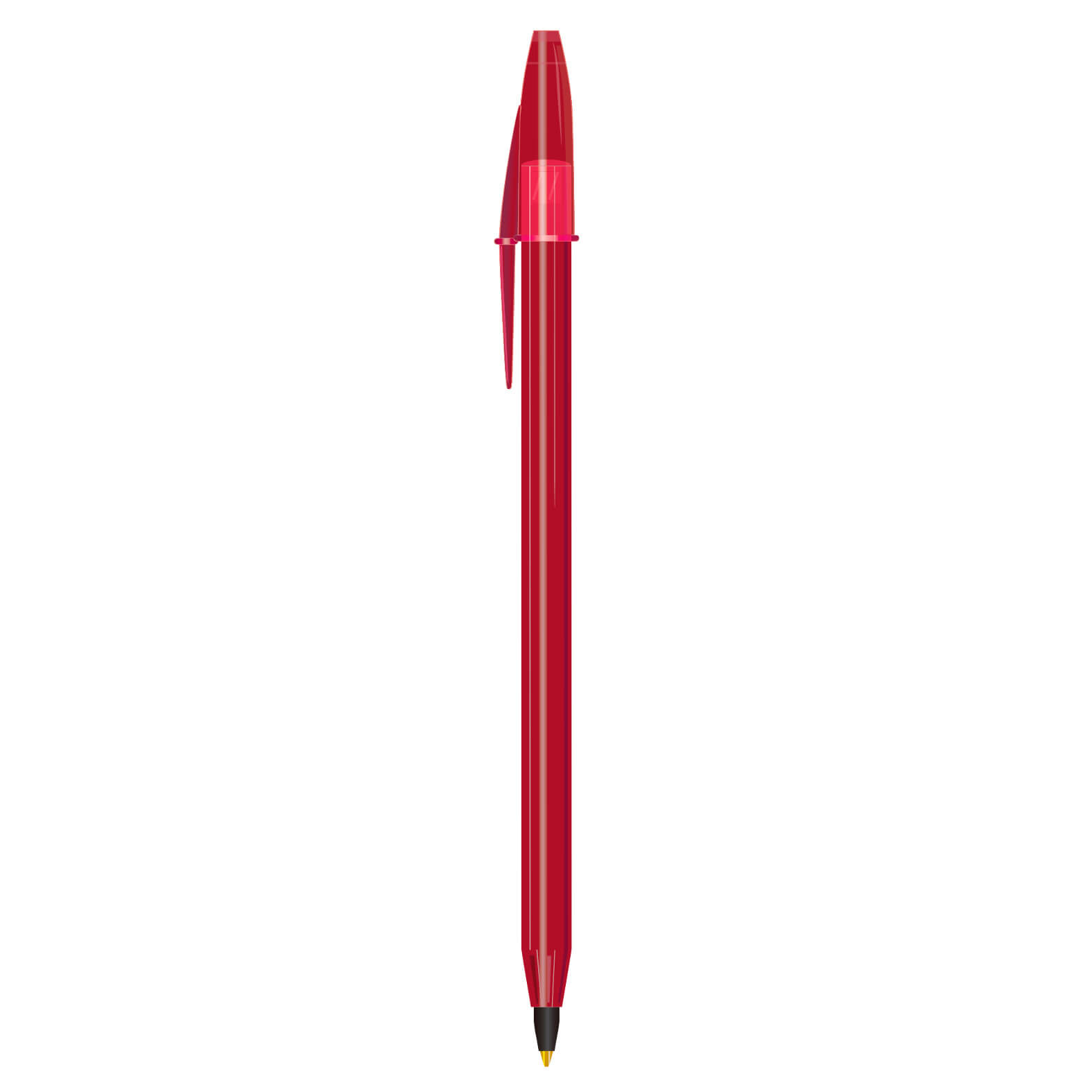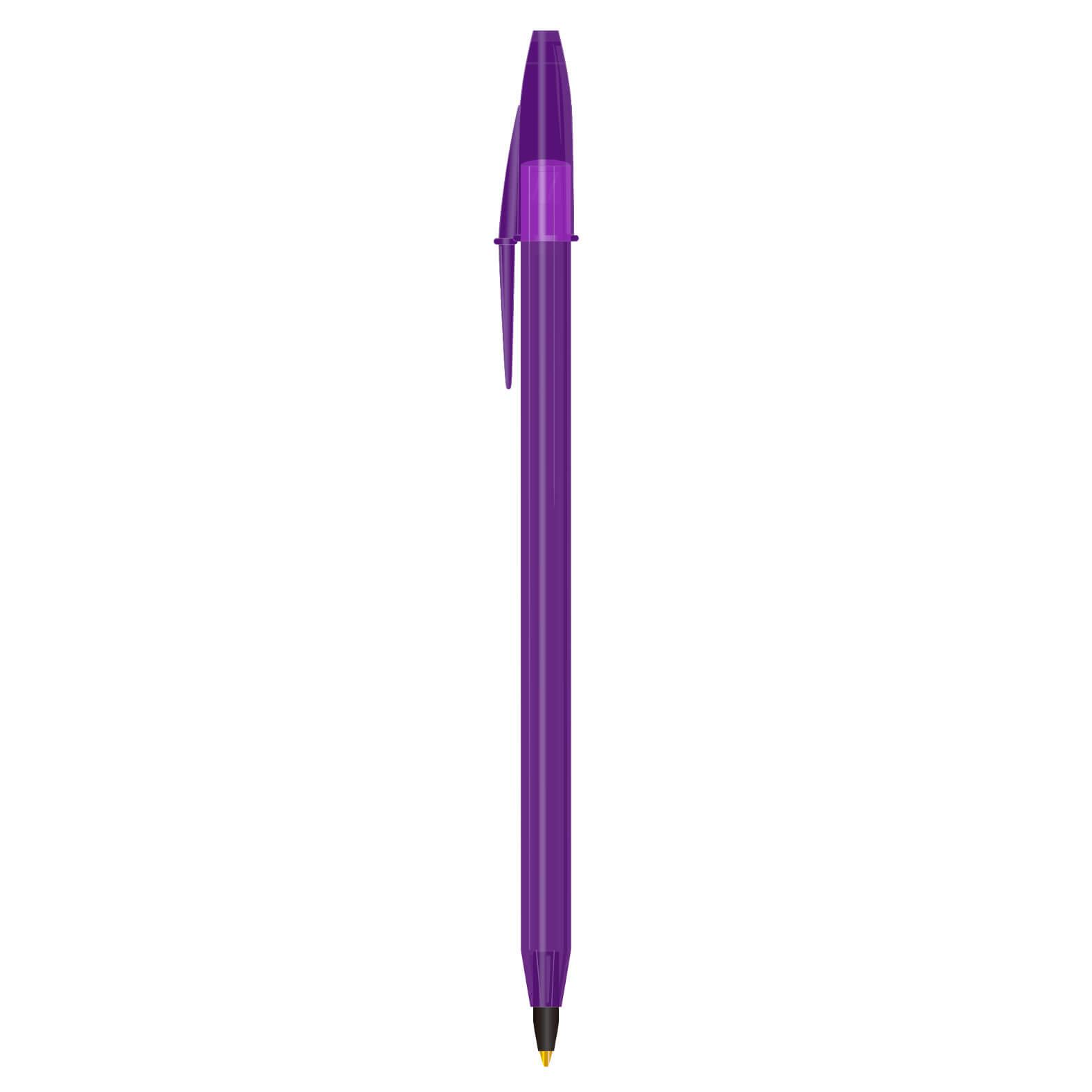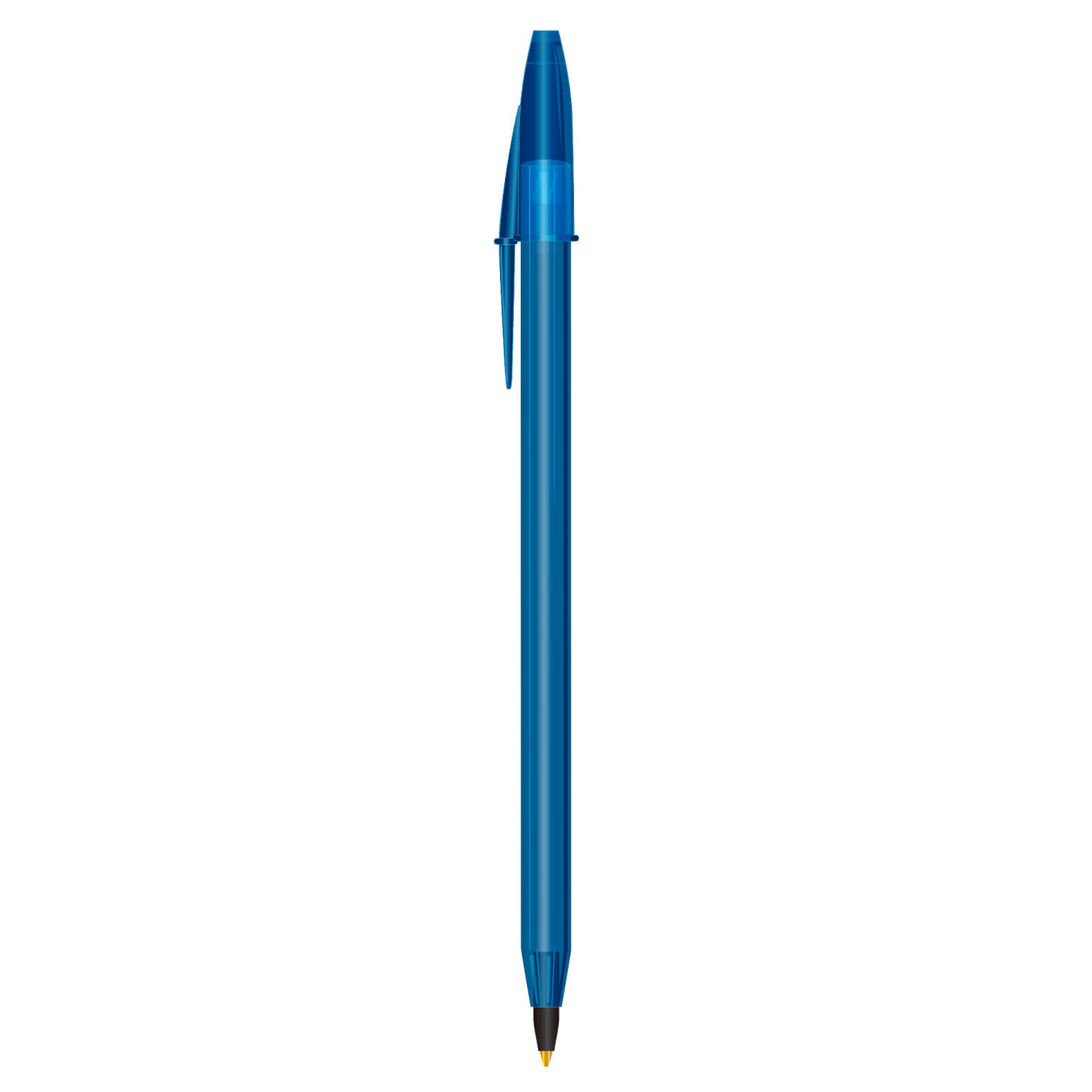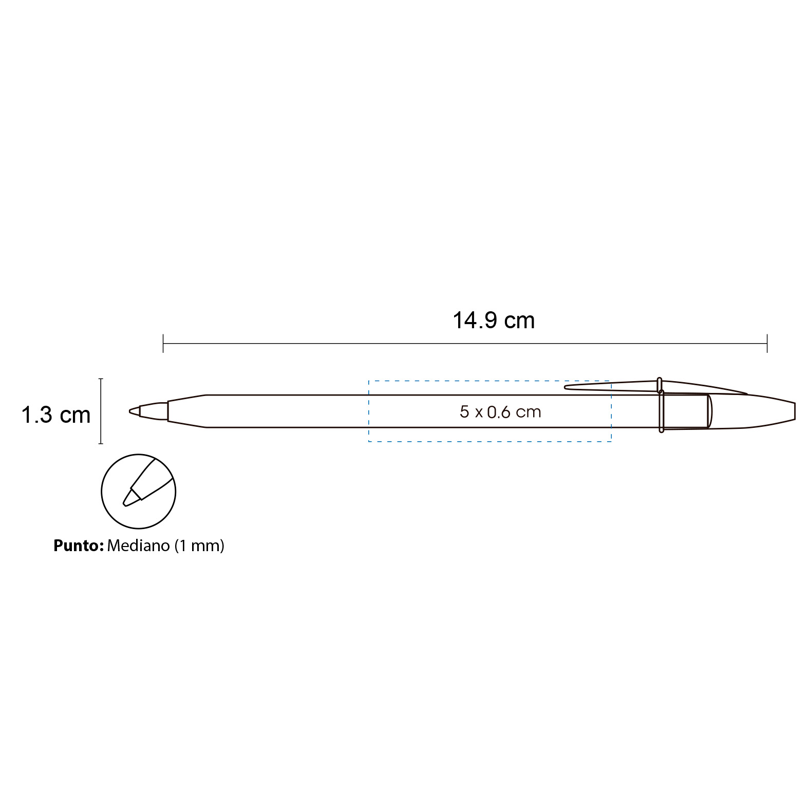 Bolígrafo de plástico traslúcido de punto mediano (1 mm) con tapa. La compra mínima es de 300 piezas y no se realizan ventas sin impresión.