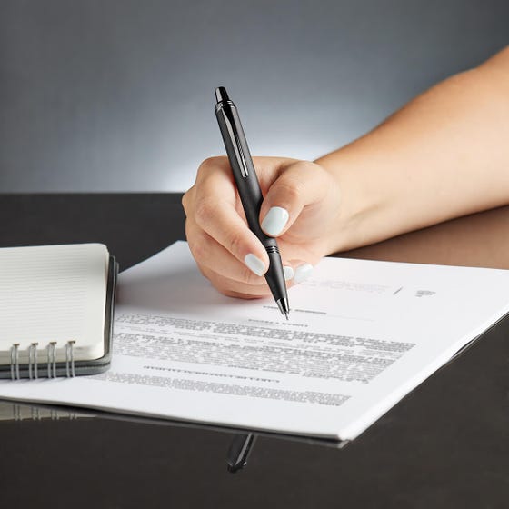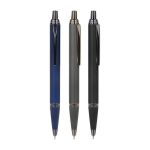 Bolígrafo metálico doble acabado mate en el cuerpo y detalles cromados. Mecanismo pulsador. Tinta negra.