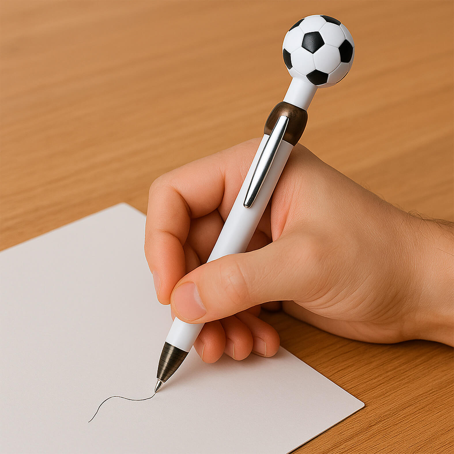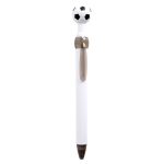 Bolígrafo plástico con clip y figura de balón en la parte superior, que sirve como botón.
