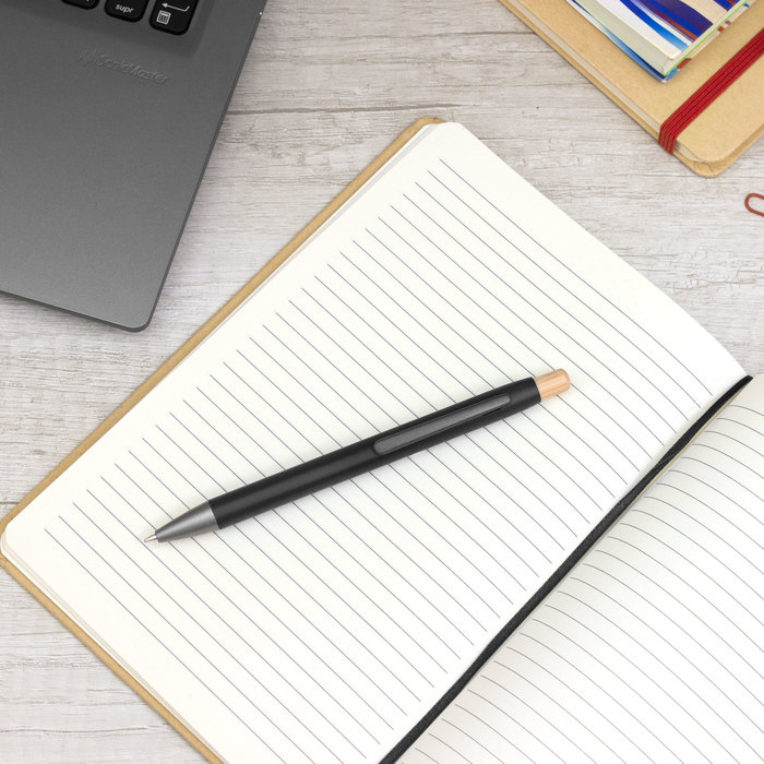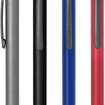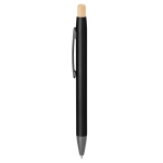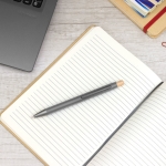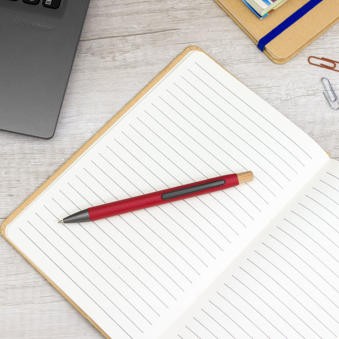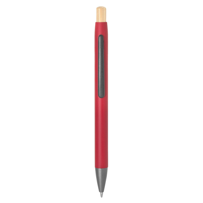 Bolígrafo retráctil. Cuerpo metálico en diferentes colores acabado mate. Clip metálico, puntera plástica color gris y pulsador de bambú