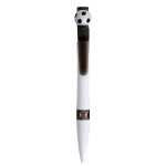 Bolígrafo plástico con clip que funciona como mecanismo de click y balón spinner en la parte superior como accesorio anti-estrés.