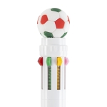 Bolígrafo de plástico multitintas con figura de balón tricolor de soccer en la parte superior, incluye 8 colores de tinta diferentes.