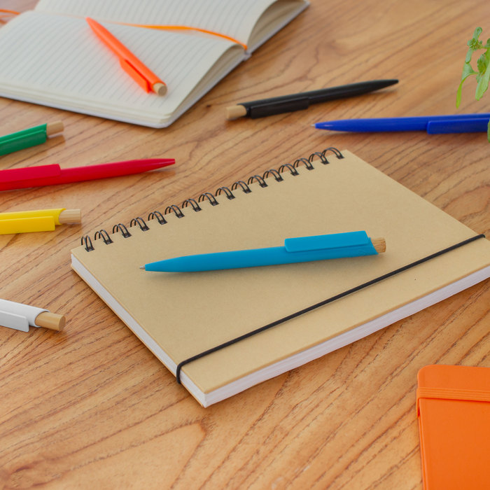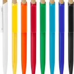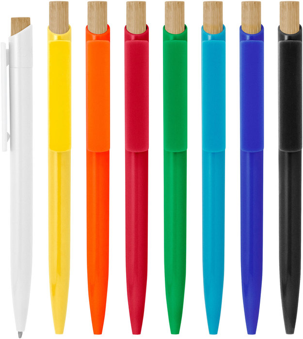 Bolígrafo retráctil. Cuerpo de diferentes colores. Pulsador de bambú. Clip del mismo color del cuerpo.