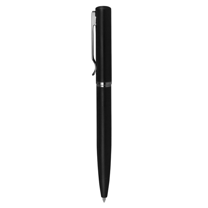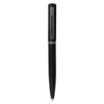 Bolígrafo con apertura giratoria. Cuerpo metálico en negro mate. Parte superior de hierro y parte inferior de acero inoxidable. Destape electroplateado en la parte superior. Recarga Parker metálico. Clip y anillos metálicos color gun.