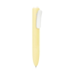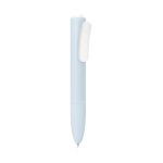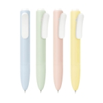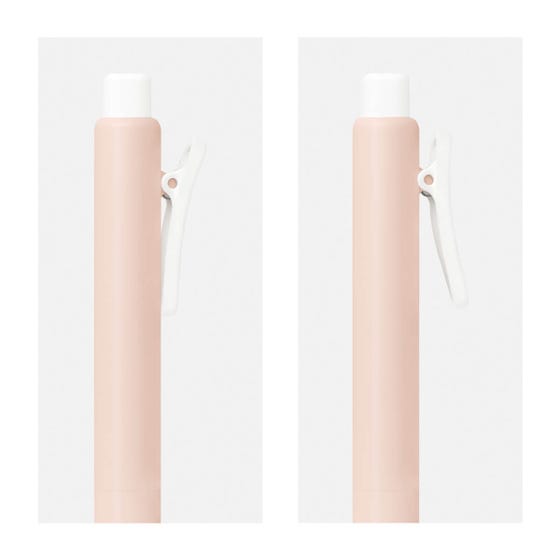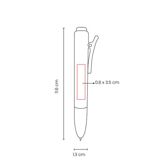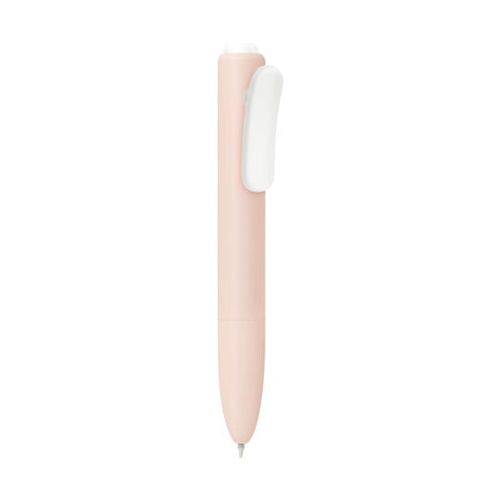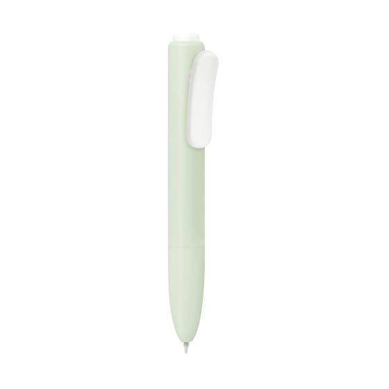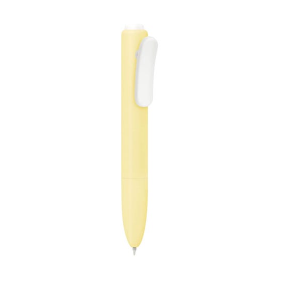 Bolígrafo de plástico con mecanismo pulsador. Su diseño destaca formas suaves y redondeadas. Agrega un clip con función de pinza que aporta un toque moderno y minimalista. Tinta negra.