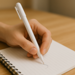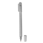 Bolígrafo de plástico con punta fina en el extremo inferior y sello de línea con figura de balón en el extremo superior.
