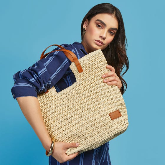 Bolsa ideal para verano. Fabricada en paja de papel tejido. Sus elegantes asas de curpiel y cerrado con broche metálico le añaden un toque sofisticado, mientras que en su interior incluye un bolsillo con cierre.