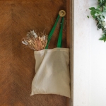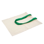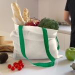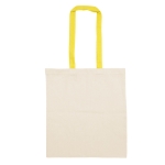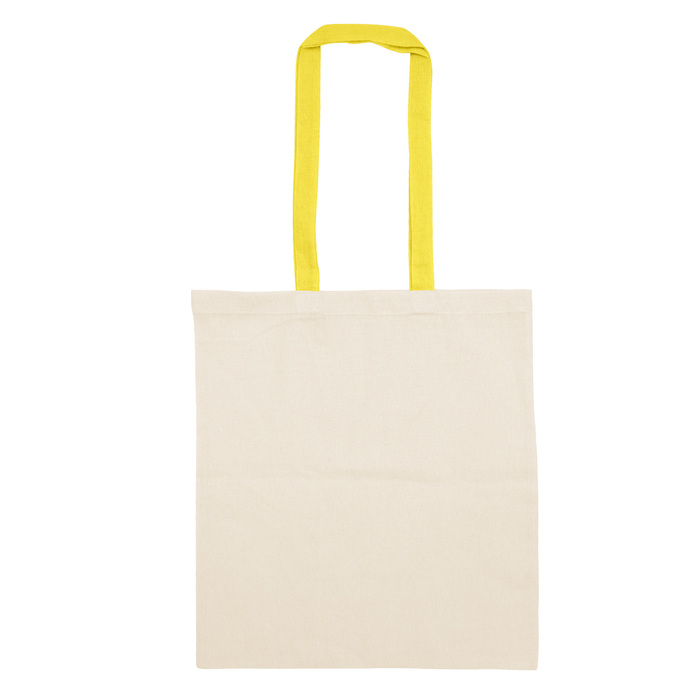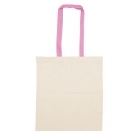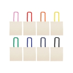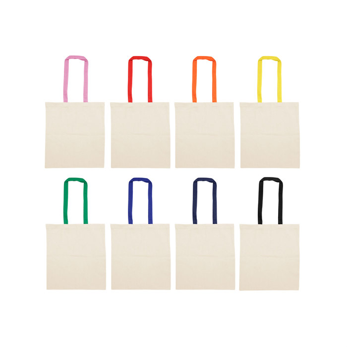 Bolsa reutilizable color natural con manijas de diferentes colores. Manijas cosidas de 70cm x 2,5 cm.
