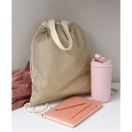 Bolsa morral fabricada en algodón 10A y yute imitación (poliéster). Cuenta con corres laterales para cerrar y llevar como mochila y asa superiores para cargar como bolsa tipo tote.
