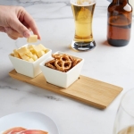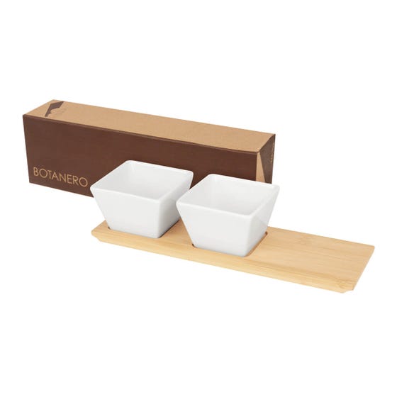 Botanero con base de bambú y dos contenedores de cerámica. Perfectos para servir botanas, dips o salsas con estilo. Ideal para reuniones, cenas o cualquier ocasión donde el diseño y la practicidad se encuentren. Incluye caja individual. El bambú es un producto natural el cual puede presentar variaciones en tonalidades y vetas.