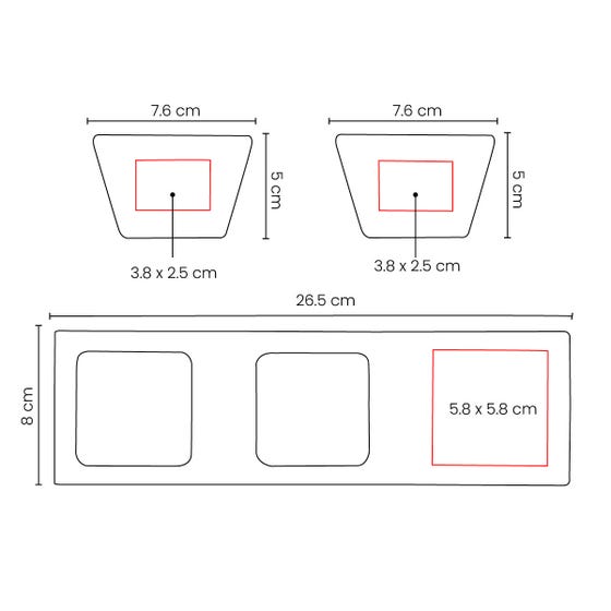 Área de impresión: 5.8 x 5.8 cm Base / 3.8 x 2.5 cm Bowl
