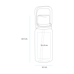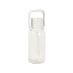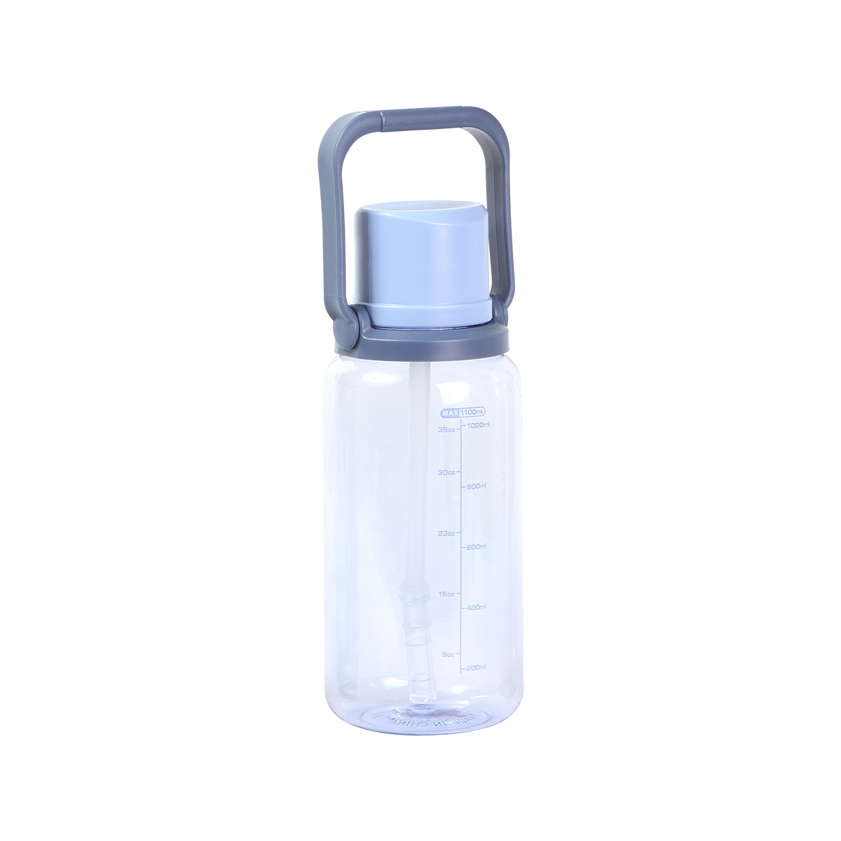 Botella de una pared fabricada en tritán, escala en milímetros y onzas. Incluye popote y agarradera en tapa. Capacidad de 1,100 ml.