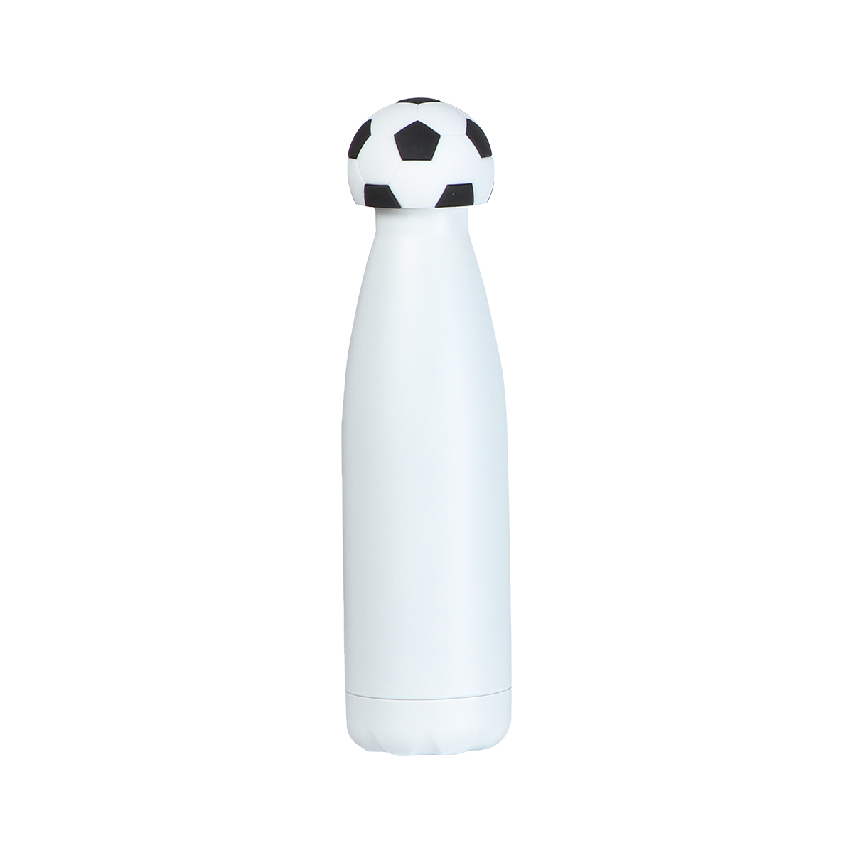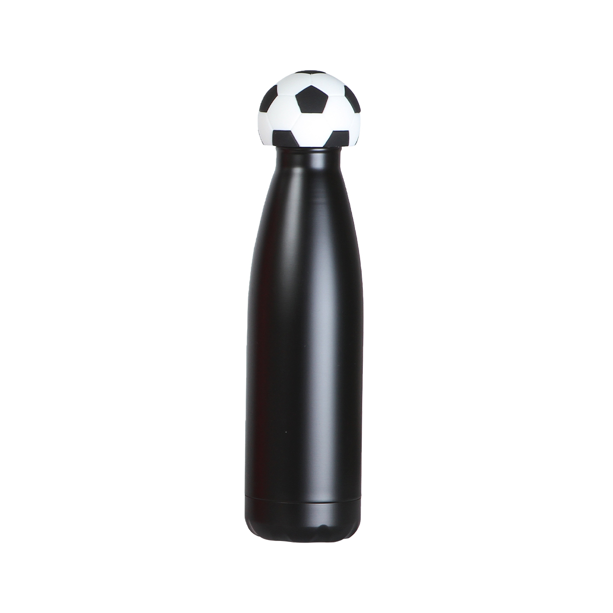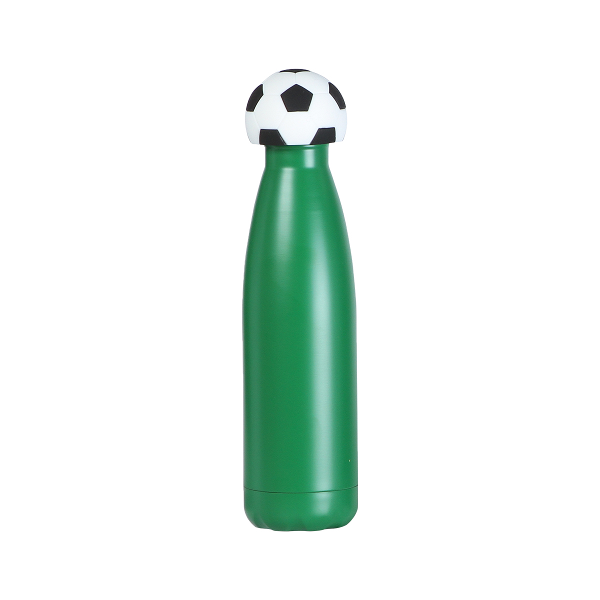 Esta botella de doble pared está fabricada en acero inoxidable. Su cuerpo presenta un diseño cilíndrico de superficies lisas y bordes firmes. Cuenta con una capacidad de 500 ml, ofreciendo un formato compacto y estable para contener líquidos. Incluye una tapa que incorpora un accesorio fabricado en silicón con forma de balón de fútbol, integrado de manera firme al conjunto. El diseño combina materiales resistentes con un acabado funcional y decorativo.
