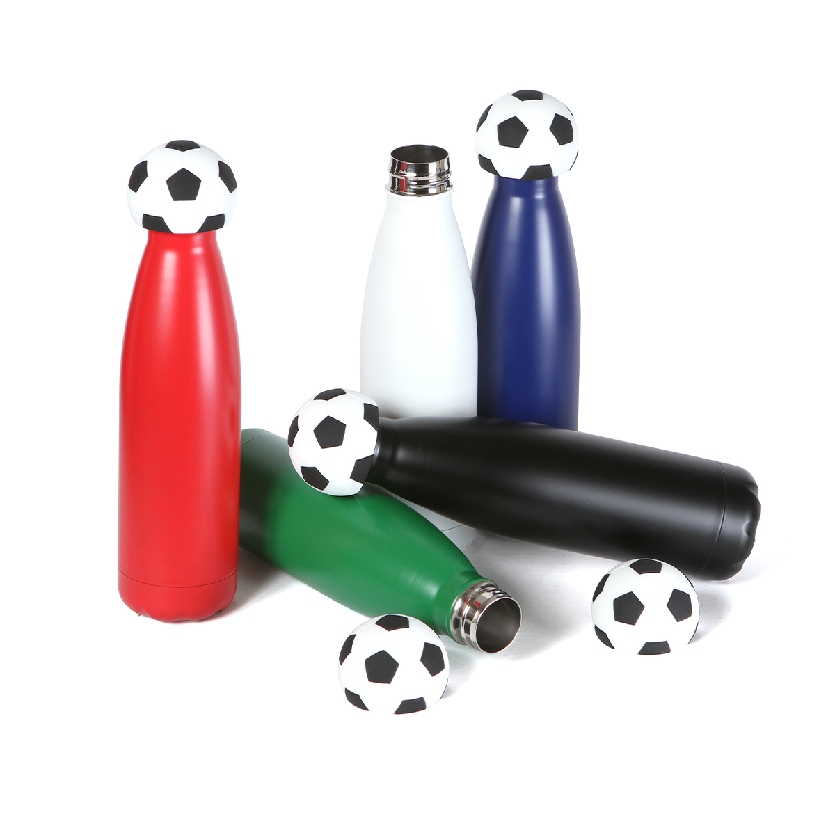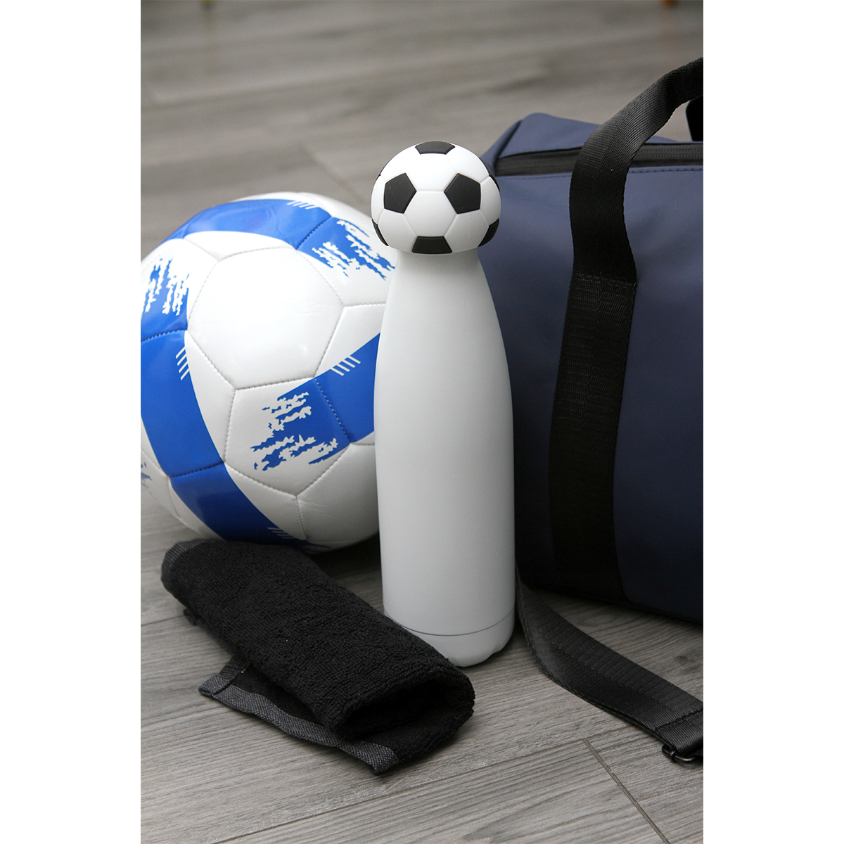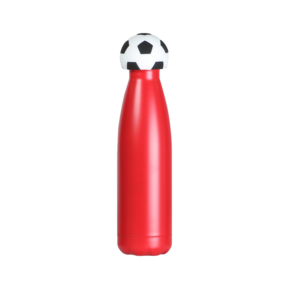 Esta botella de doble pared está fabricada en acero inoxidable. Su cuerpo presenta un diseño cilíndrico de superficies lisas y bordes firmes. Cuenta con una capacidad de 500 ml, ofreciendo un formato compacto y estable para contener líquidos. Incluye una tapa que incorpora un accesorio fabricado en silicón con forma de balón de fútbol, integrado de manera firme al conjunto. El diseño combina materiales resistentes con un acabado funcional y decorativo.