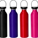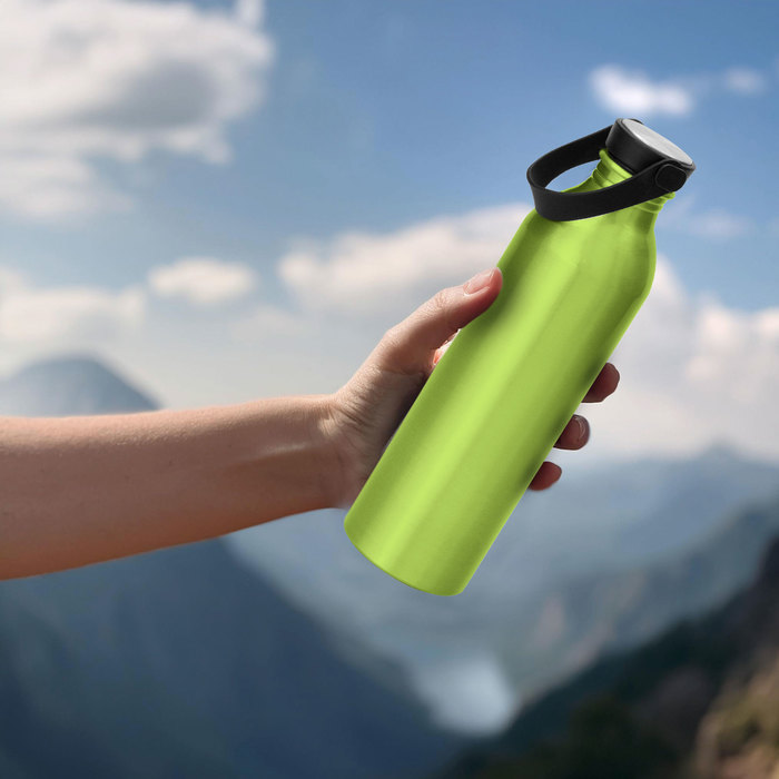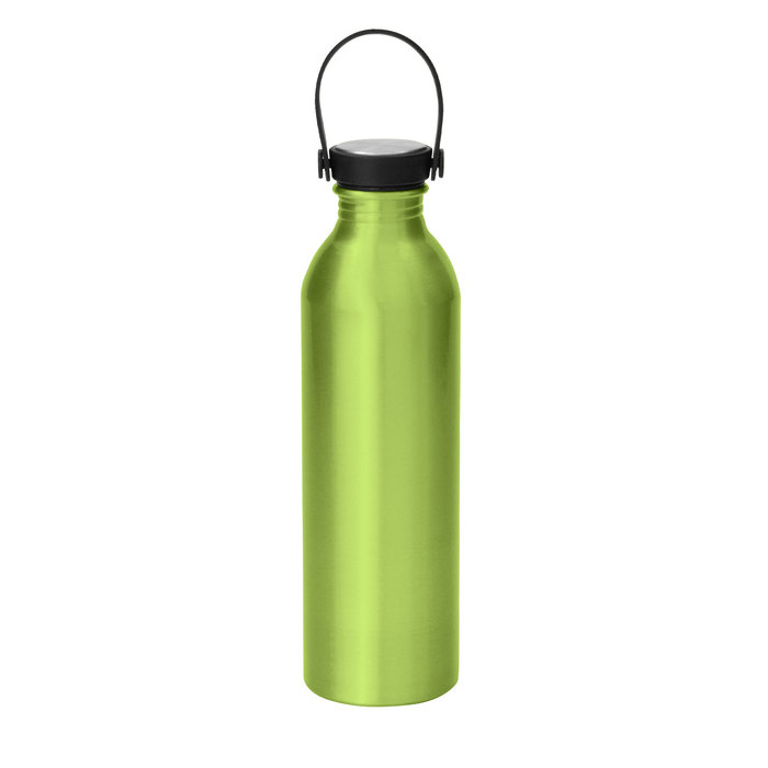 Botella de aluminio con acabado brillante. Tapa a rosca de acero inoxidable 201 y Polipropileno, con tira de silicona color negro.