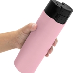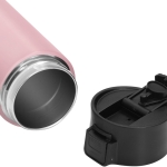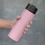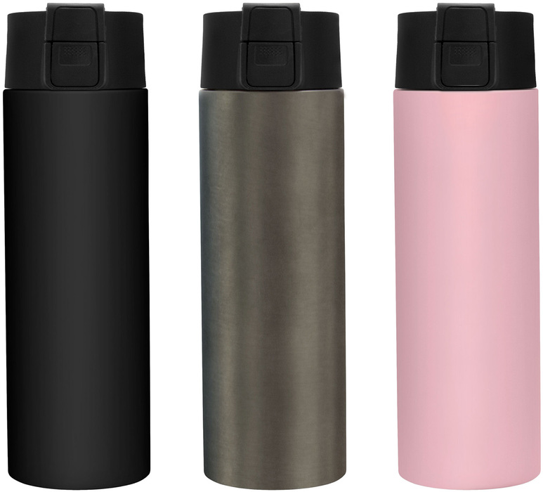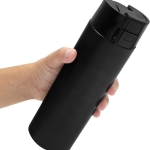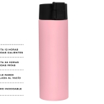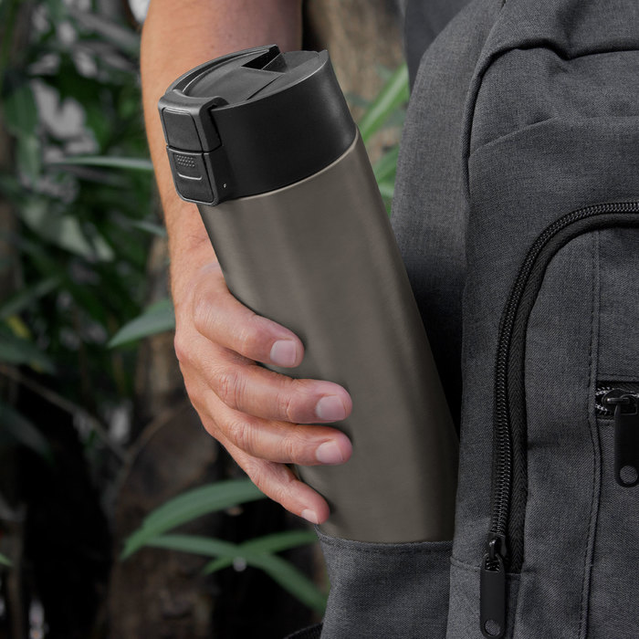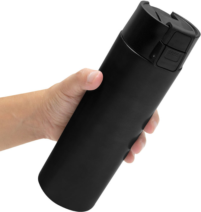 Mantiene por más de 12 hs la temperatura de las bebidas calientes y 24 hs de las bebidas frías. Presentación en caja de regalo kraft. Acero inoxidable. Capacidad 450 ml. Botella doble pared, sellada al vacío. Interior de acero 304 y exterior de acero 201. Pintura acabado mate. Tapa en PP con traba de seguridad y botón pulsador de apertura.