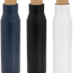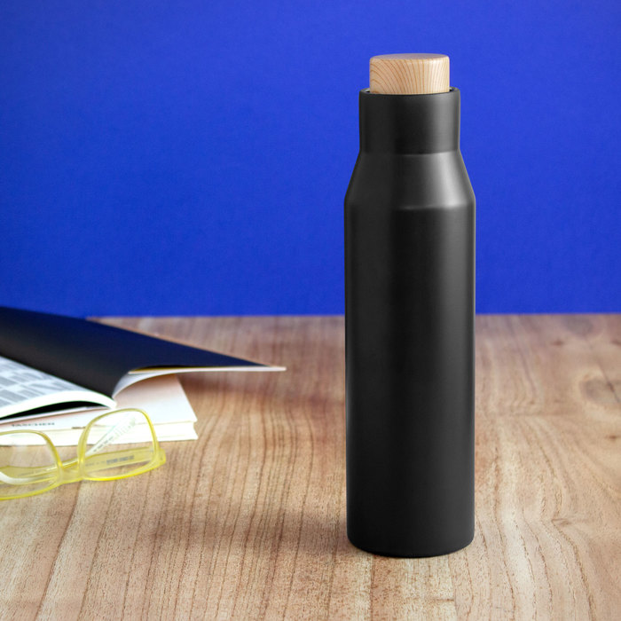 Botella doble pared, sellada al vacío. Interior de acero 304 y exterior de acero 201. Pintura acabado mate. Tapa a rosca con anillo de silicona, interior de acero 201 y exterior en polipropileno imitación bambú. Mantiene por más de 12 hs la temperatura de las bebidas calientes y 24 hs de las bebidas frías.