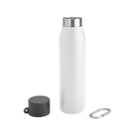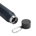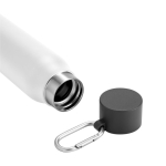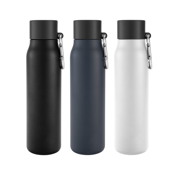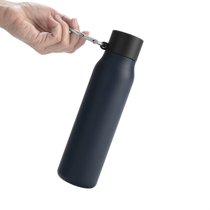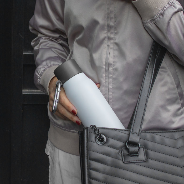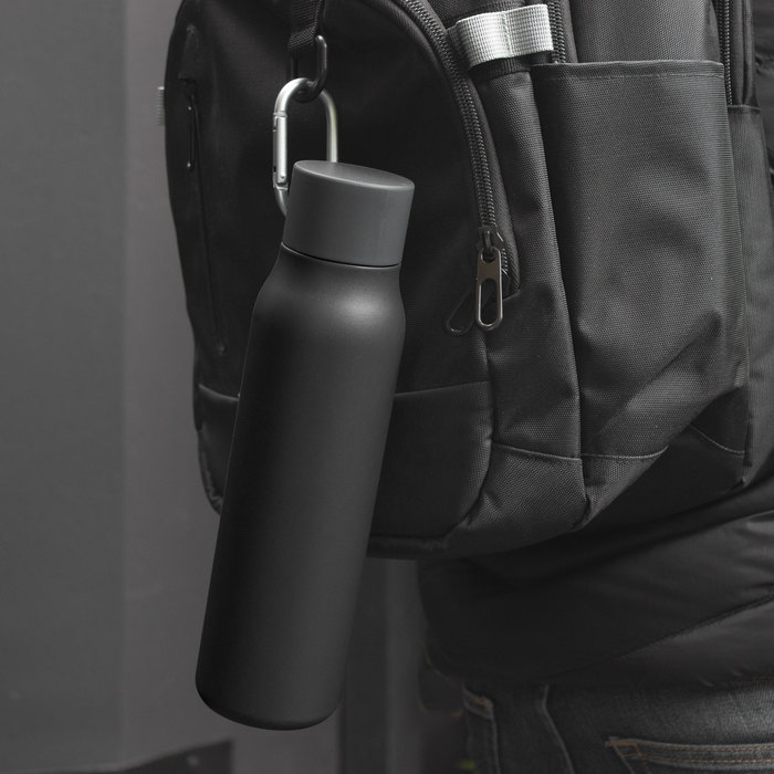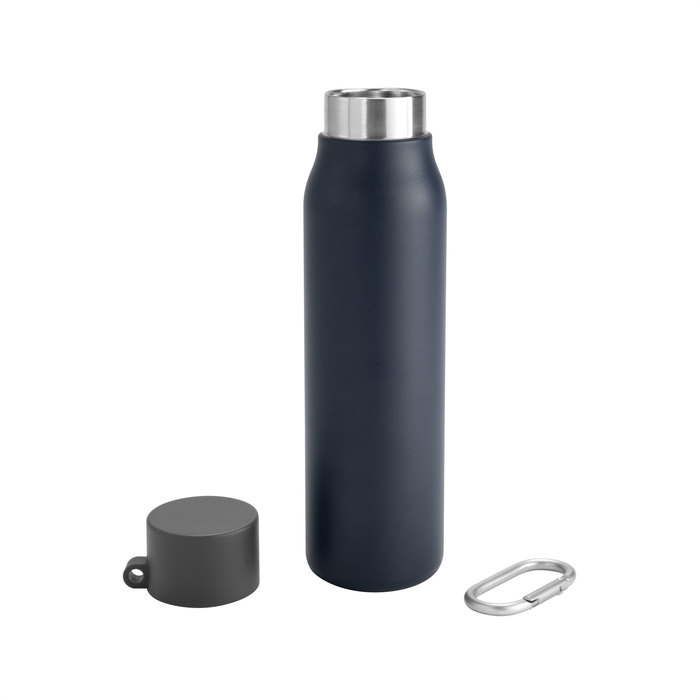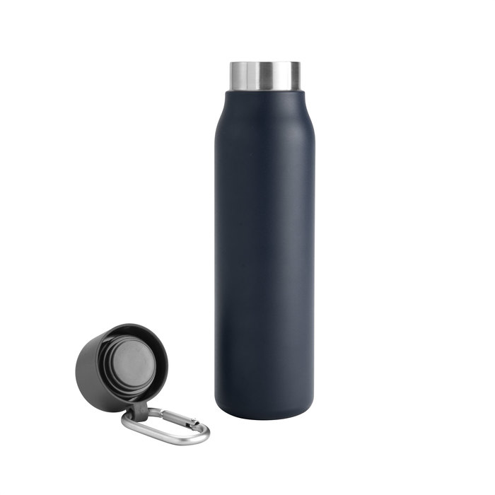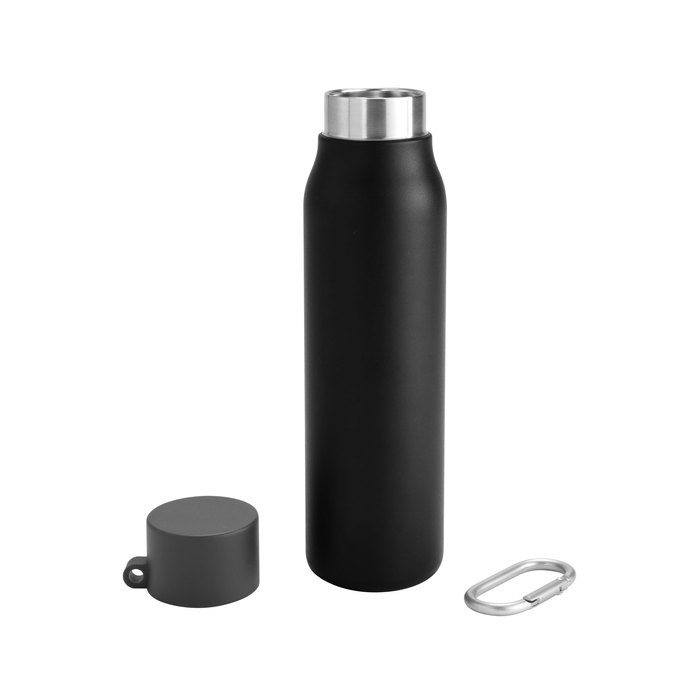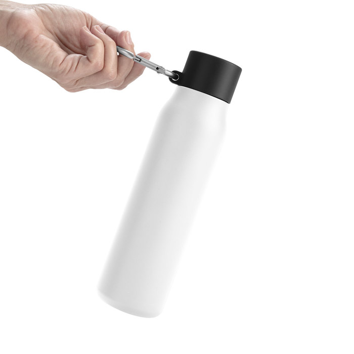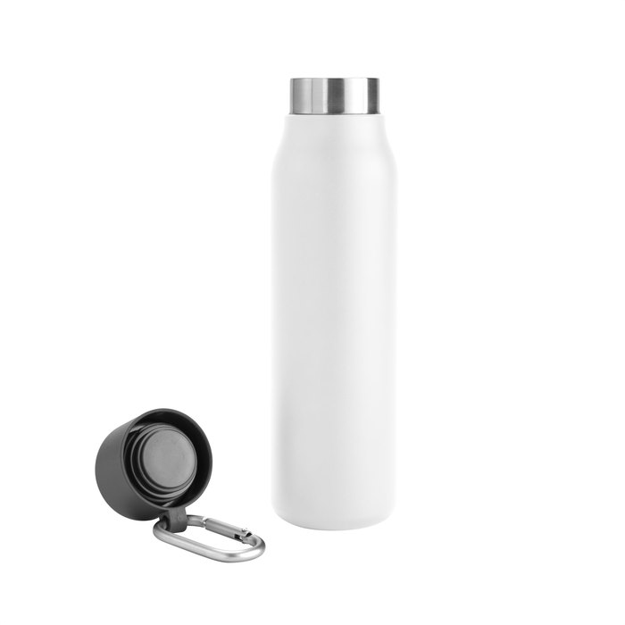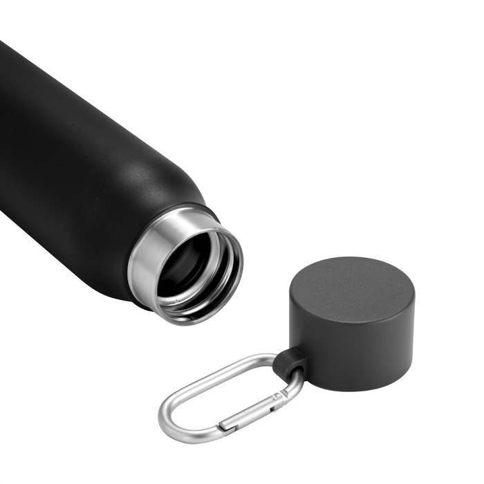Botella doble pared, sellada al vacío. Interior en acero 304 reciclado y exterior en acero 201. Pintura powder coat (pintura más duradera y resistente a la corrosión y el paso del tiempo). Tapa plástica de polipropileno y anillo de silicona con mosquetón de aluminio. Mantiene hasta 12 hs la temperatura de las bebidas calientes y 24 hs de las bebidas frías