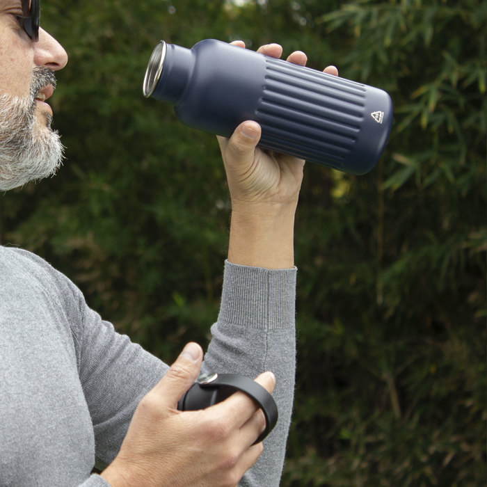 Botella doble pared, sellada al vacío. Botella con aislamiento térmico. Tecnología vacuum. Interior de acero 304 reciclado y exterior de acero 201. Tapa a rosca de polipropileno, interior plástico. Asa reforzada de silicona. Pintura acabado semi mate. Cuerpo texturado para un mejor agarre. Mantiene hasta 12 hs la temperatura de las bebidas calientes y 24 hs de las bebidas frías.