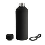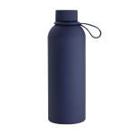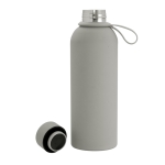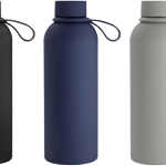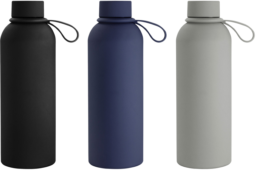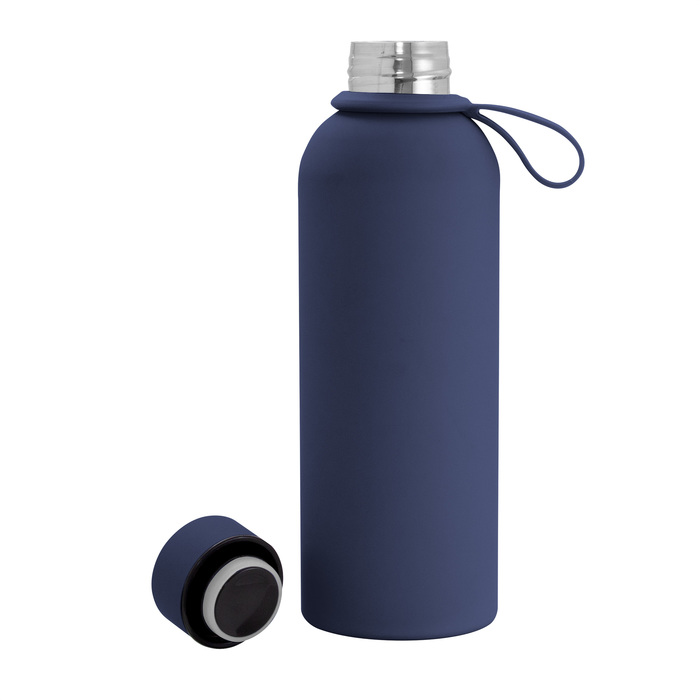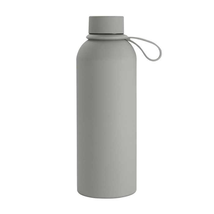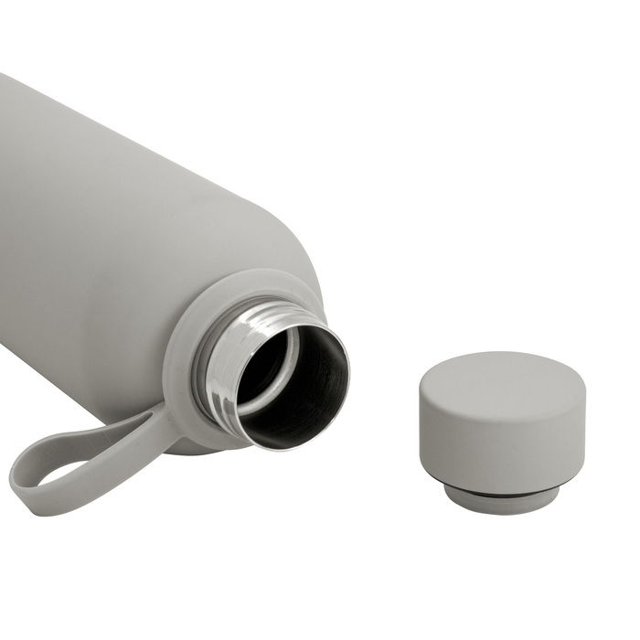 Botella doble pared, sellada al vacío. Interior de acero 304 y exterior de acero 201. Tapa a rosca de acero 201, interior plástico con anillo de silicona. Asa de silicona para un transporte fácil. Pintura con terminación suave al tacto. Mantiene hasta 6 hs la temperatura de las bebidas calientes y 12 hs de las bebidas frías.