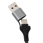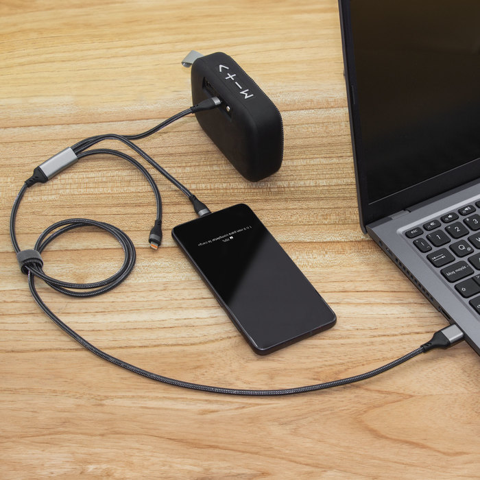 Cable de carga rápida. Entrada 2 en 1: USB y USB-C. Salida: USB-C, microUSB y lightning. Max 20V 3A. Color gun con toques naranjas en cada conector. Precinto de velcro fijada al cable.
