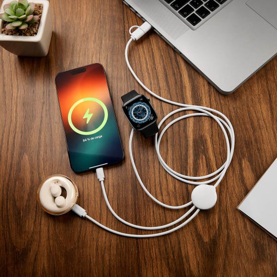 Cable cargador 5 en 1. Incluye conector de entrada USB y tipo C, conector de salida lightning (8 pines), micro USB, tipo C y cargador inalámbrico para reloj inteligente (compatible con dispositivos que cuenten con tecnología de carga inalámbrica). Este cable multifunción, permite cargar varios dispositivos simultánemanete, lo que te ayuda a ahorrar tiempo y espacio. No admite la transferencia de datos.