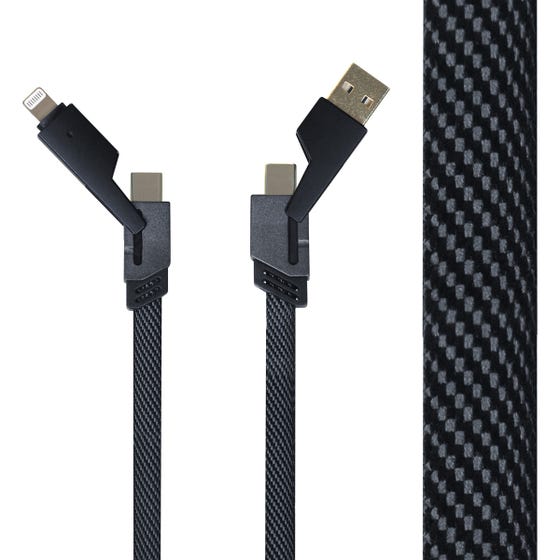 Cable de carga rápida 4 en 1. Incluye conector de entrada USB y USB-C, conector de salida lightning (8 pines) y tipo C. Su cable plano con diseño trenzado evita enredos y nudos. Soporta la carga de smartphones, tabletas y otros dispositivos con entrada de carga rápida de hasta 65 W. Admite la transferencia de datos. Incluye caja individual.