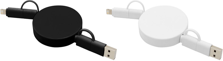 Cable de carga retráctil con longitud de hasta 90 cm. Carga y transferencia de datos de alta velocidad. Carga rápida de 65W. Entrada 2 en 1: USB y USB-C. Salida: 2 en 1: Lightning y USB-C. Diseño con acabado mate.