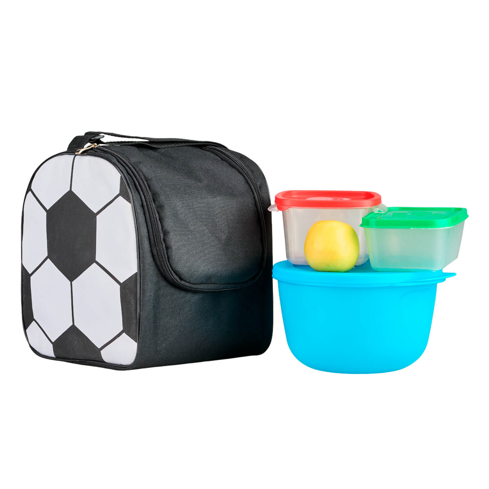 Lonchera con un compartimento, interior permeable, cierre, print de balón de soccer en los laterales y correa ajustable.
