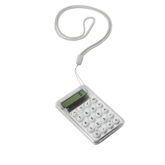 Calculadora de 8 dígitos. Ideal para funciones básicas. Incluye cordón de 40 cm. Batería de botón incluida.