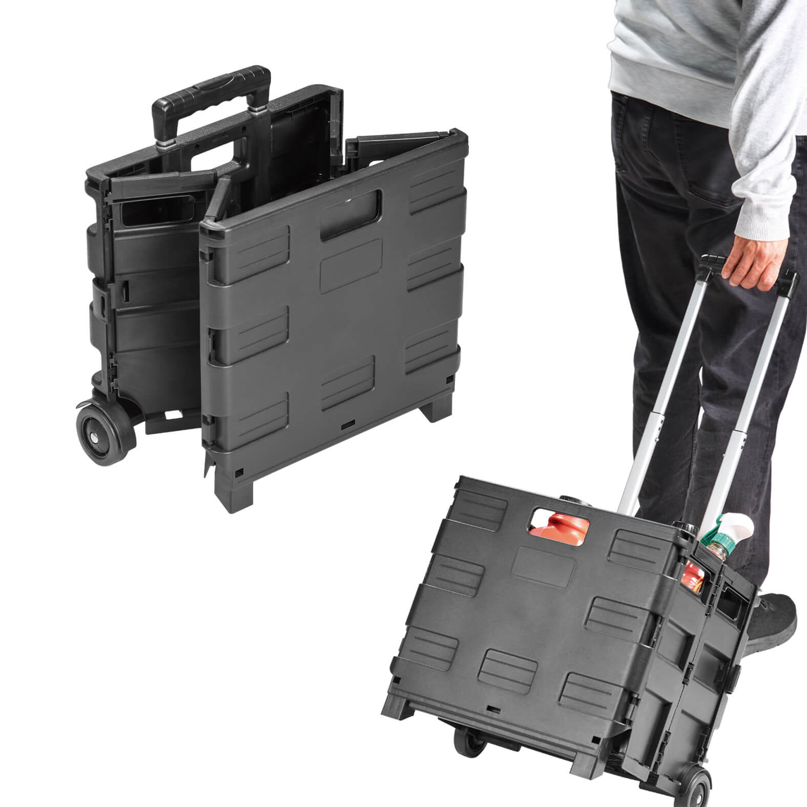 Carrito plegable portátil para supermercado, fabricado en plástico, con 2 ruedas, asa metálica retráctil y seguros a presión.
