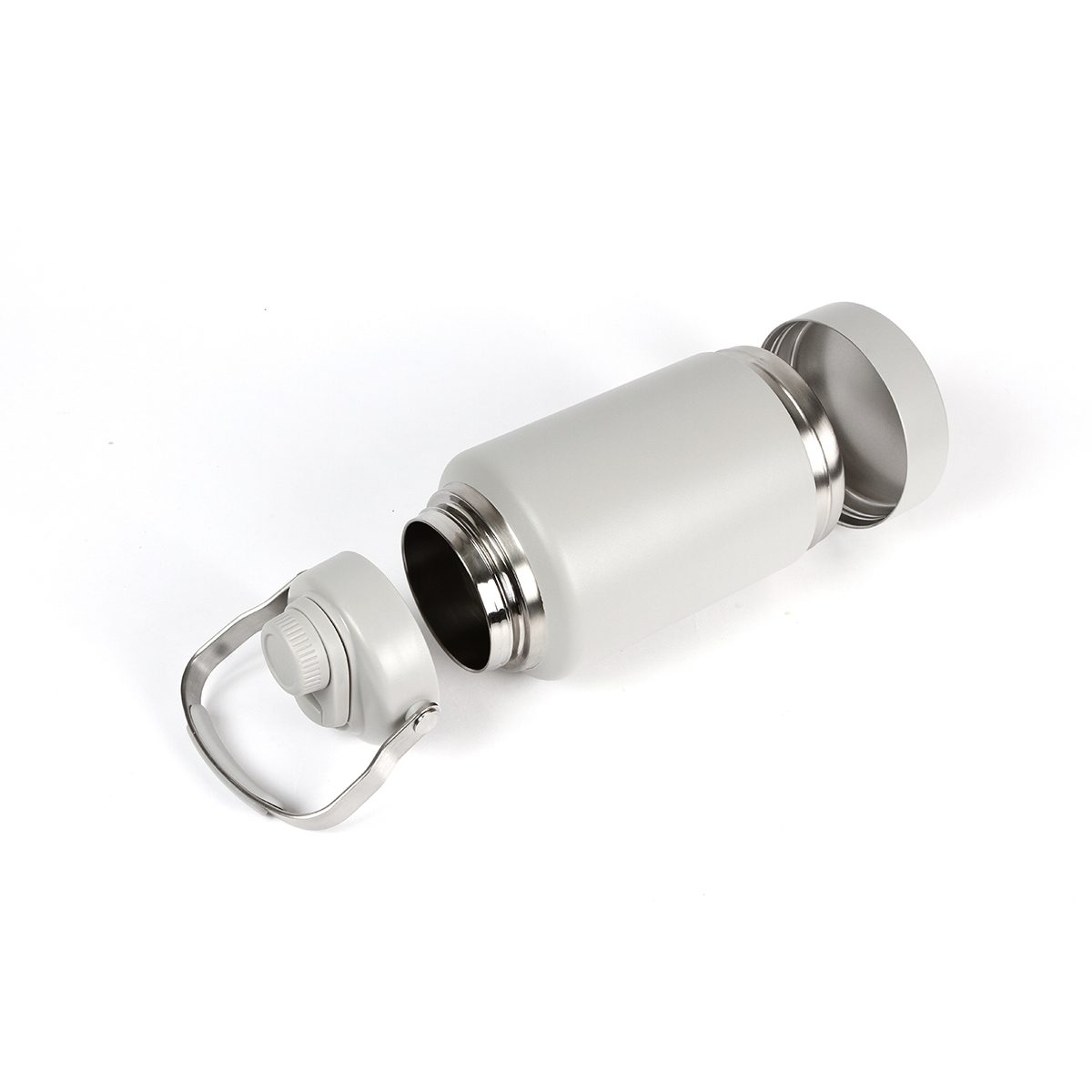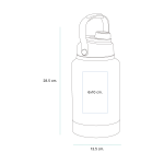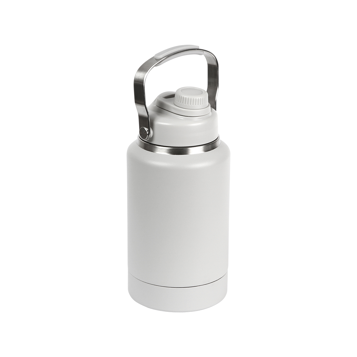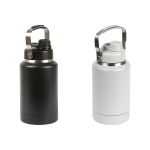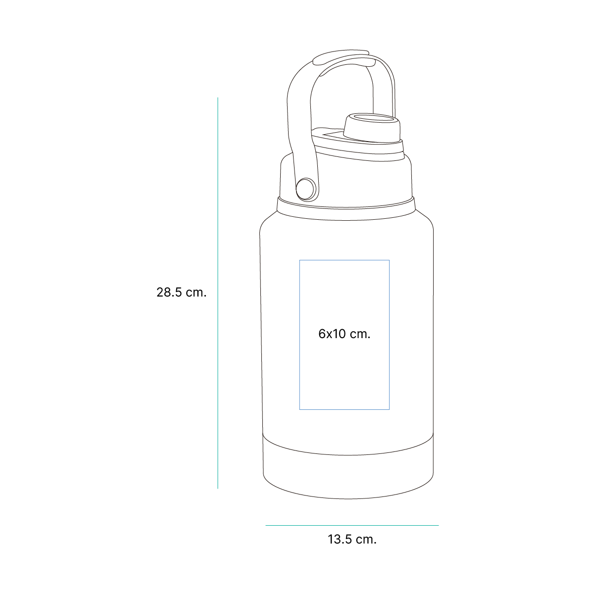 Cilindro doble pared fabricado en acero inoxidable 604, tapa de seguridad de rosca con boquilla. Capacidad de 1,800 ml. Incluye caja de color individual y asa metálica para transportar, peso 1,150 g.
