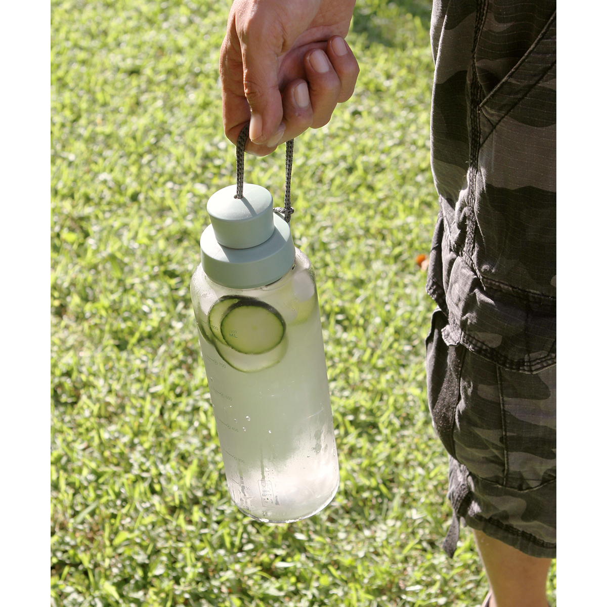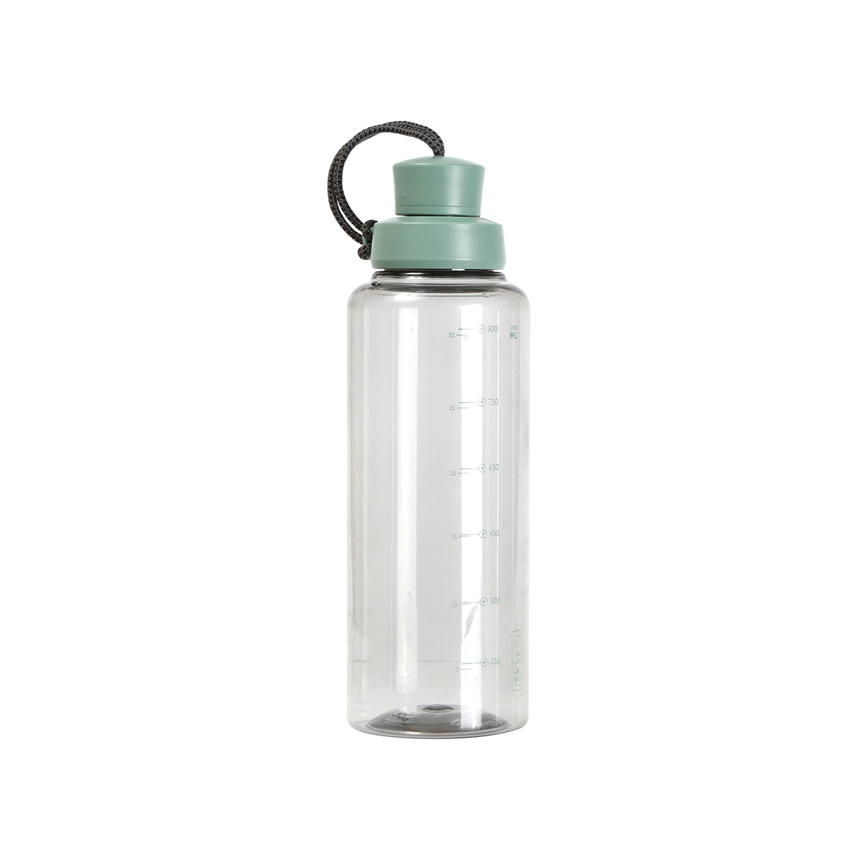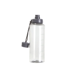 Cilindro transparente fabricada en policarbonato, con indicadores en mililitros y onzas, tapa de color y cordón sujetador tipo asa. Capacidad 1 litro.