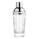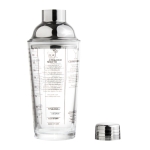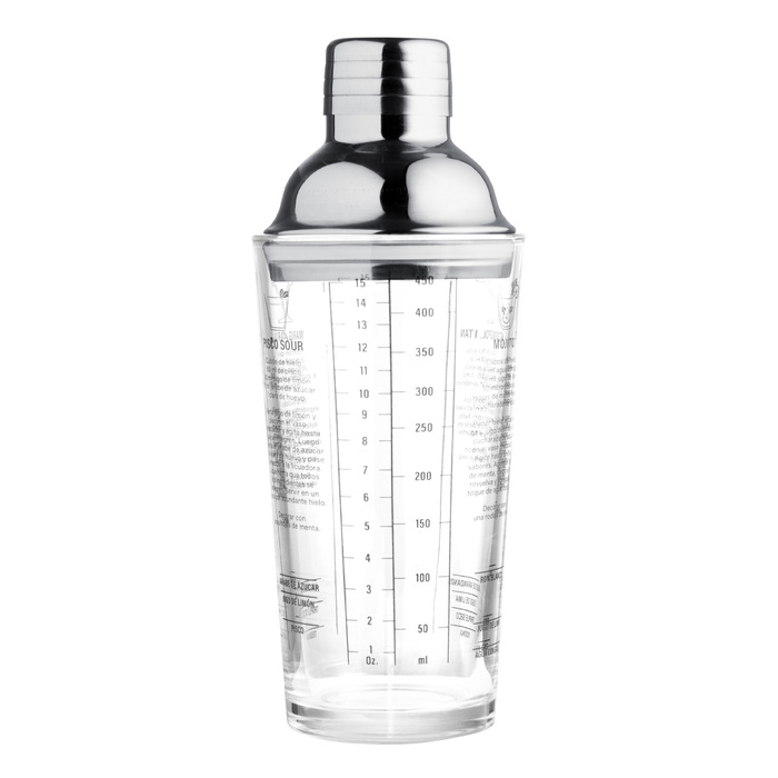 Vidrio sodocálcico y acero inoxidable. Coctelera de vidrio. Tapa de acero 202 con junta de silicona. Impresión de tragos en español en el cuerpo de vidrio. Presentacion en caja de regalo kraft.