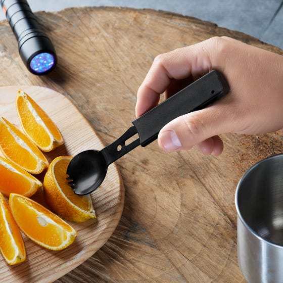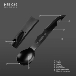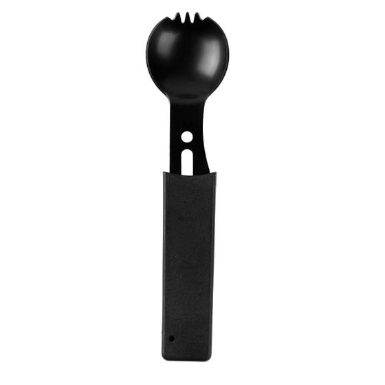 Cubierto metálico multifuncional que integra tenedor, cuchillo, destapador, desescamador, orificio para cuerda y silbato de emergencia. Ligero, práctico y listo para acompañarte en cada aventura.