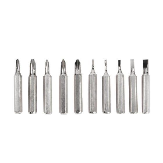 Desarmador con 10 puntas intercambiables. Incluye 5 puntas de cruz y 5 planas, organizadas en un compartimento interno que las mantiene seguras y al alcance de tu mano. Su innovador sistema push para abrir y cerrar asegura que las puntas permanezcan en su lugar, evitando pérdidas y facilitando su uso.