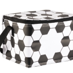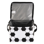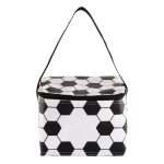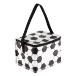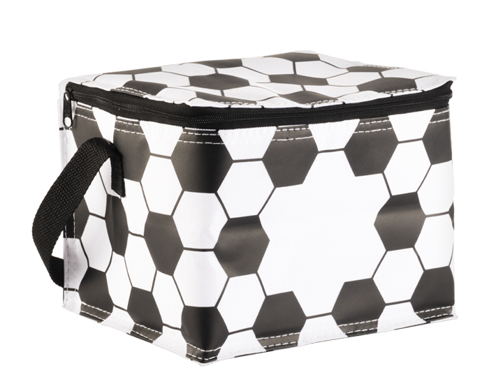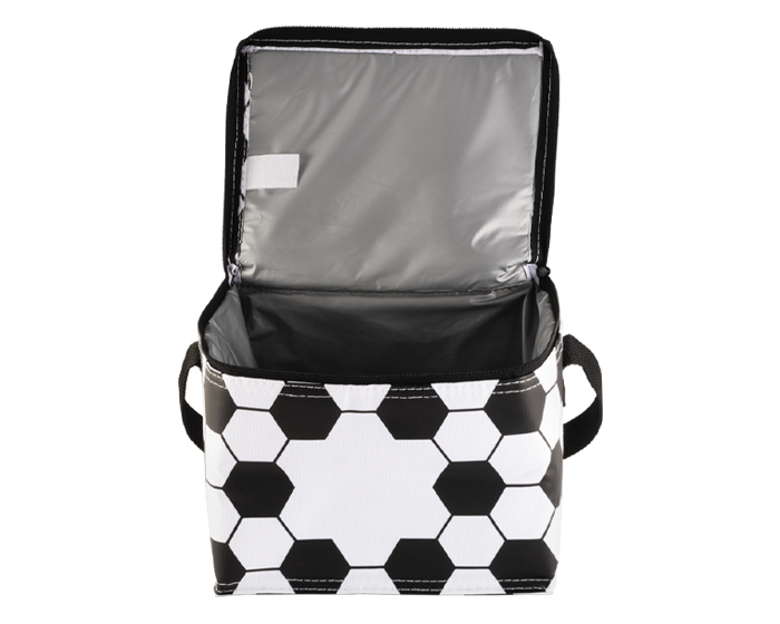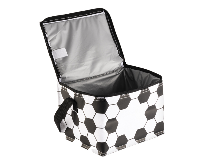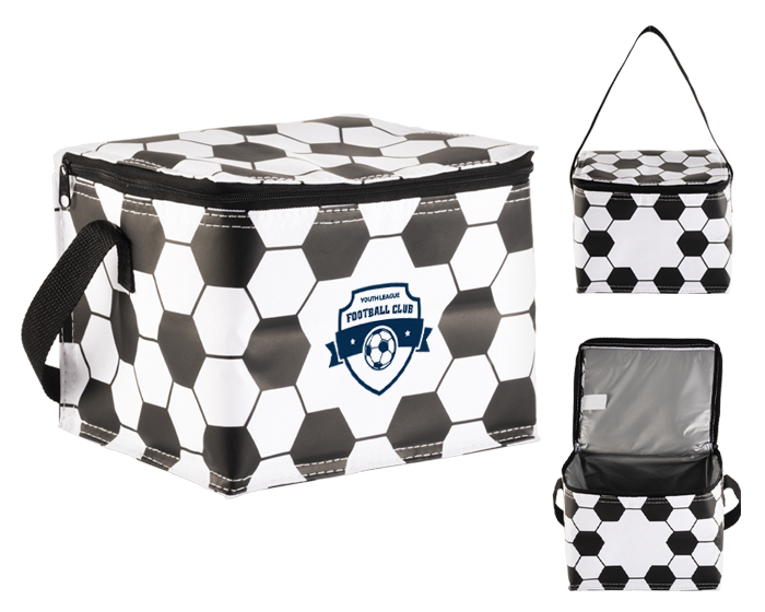 Lonchera / Hielera rectangular con diseño de balón de fútbol soccer, tiene cubierta cosida e interior termosellado en plástico anti escurrimiento. Cuenta con cierre y correa larga. CAP. 6 latas.