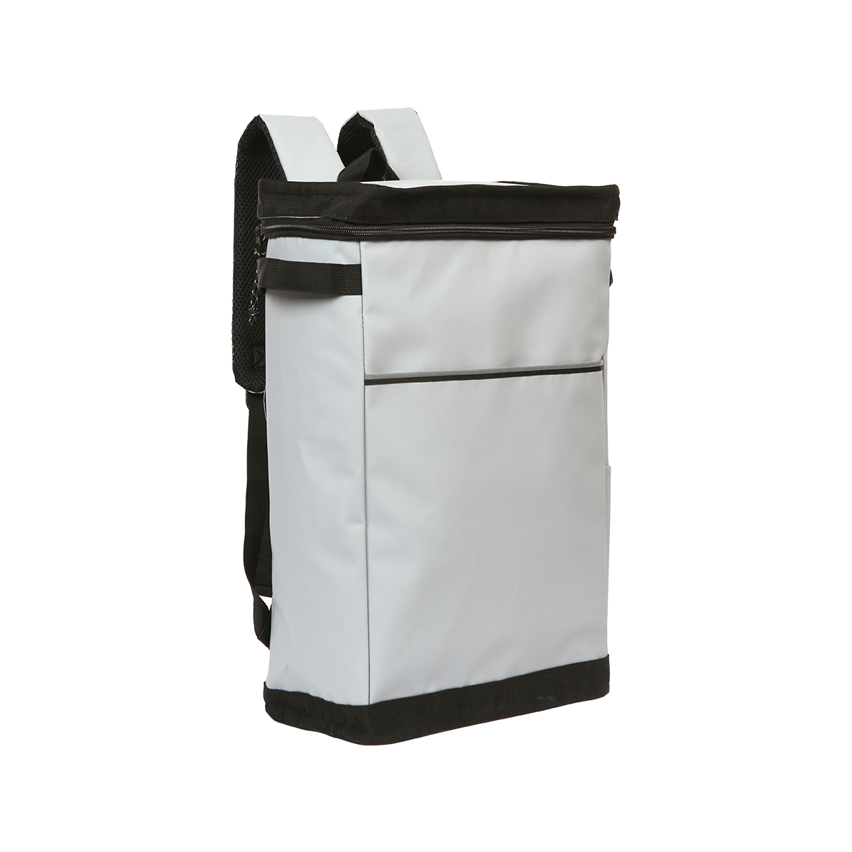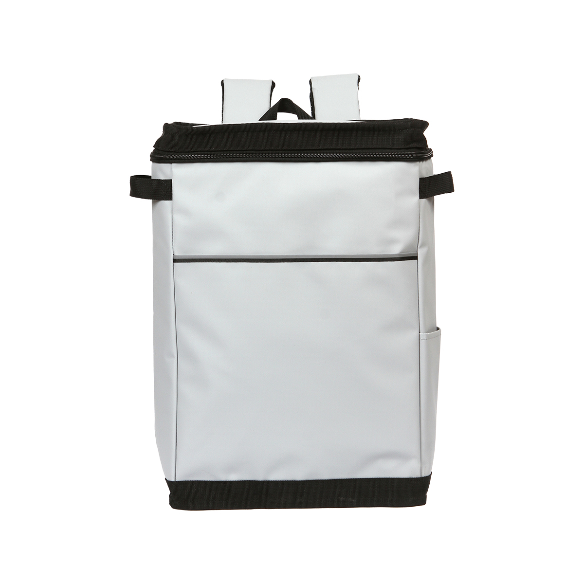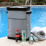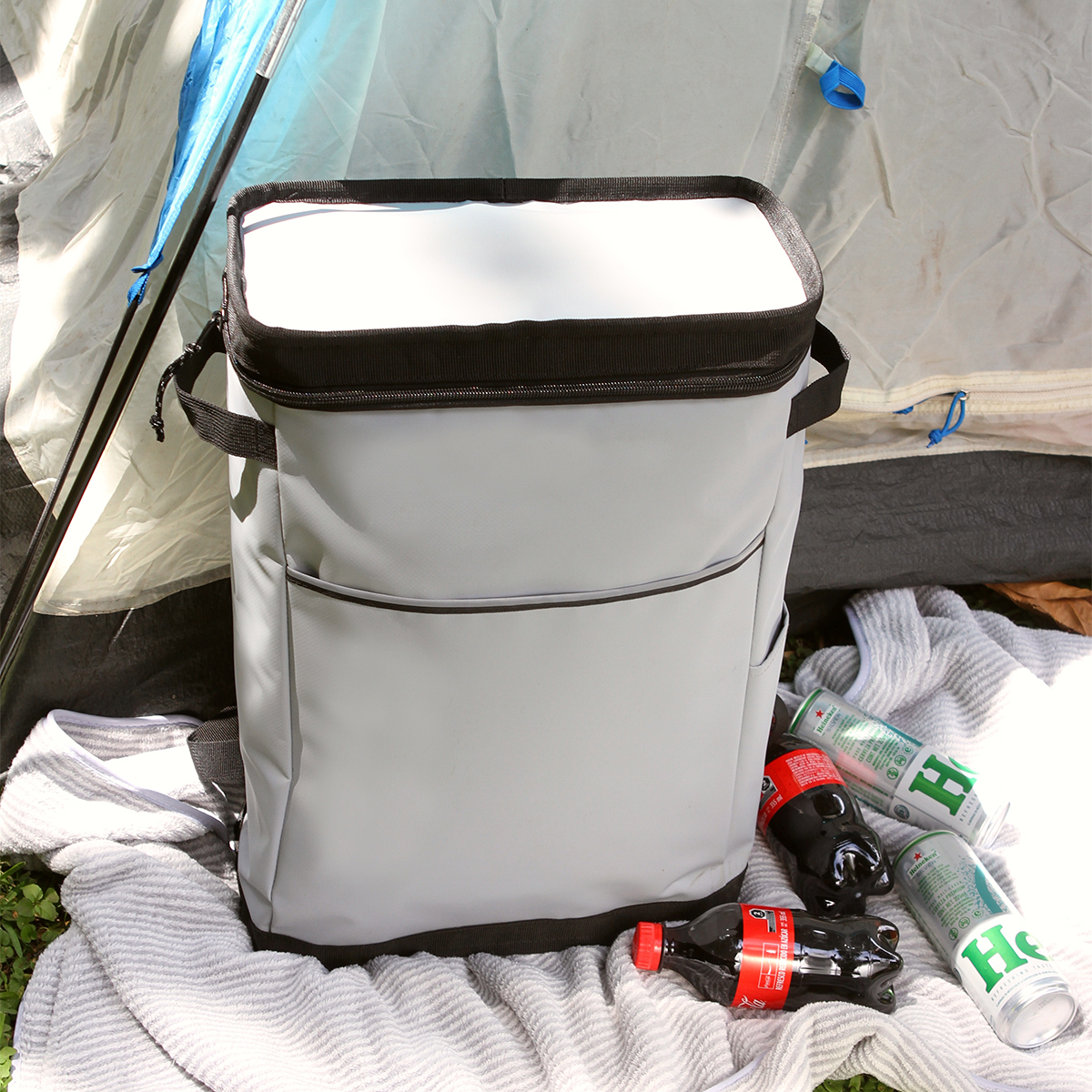 Hielera tipo mochila fabricada en poliéster y PVC con forro interno de PEVA. Cuenta con un compartimento principal con cierre y dos asa pequeñas laterales para su mejor manipulación.