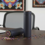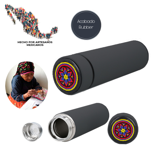 Termo de acero inoxidable con doble pared aislada al vacío e infusor metálico, con técnica huichol en chaquira. Cada pieza está elaborada a mano con 800 chaquiras colocadas una a una por artesanos de Jalisco. Con cada compra apoyas el trabajo que representa el sustento económico de estas familias artesanas.