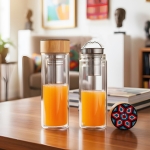 Termo de vidrio con doble pared e infusor metálico, con tapa de bambú decorada con arte huichol. Cada pieza está elaborada a mano con 890 chaquiras colocadas una a una por artesanos de Jalisco. Con cada compra apoyas el trabajo que representa el sustento económico de estas familias artesanas