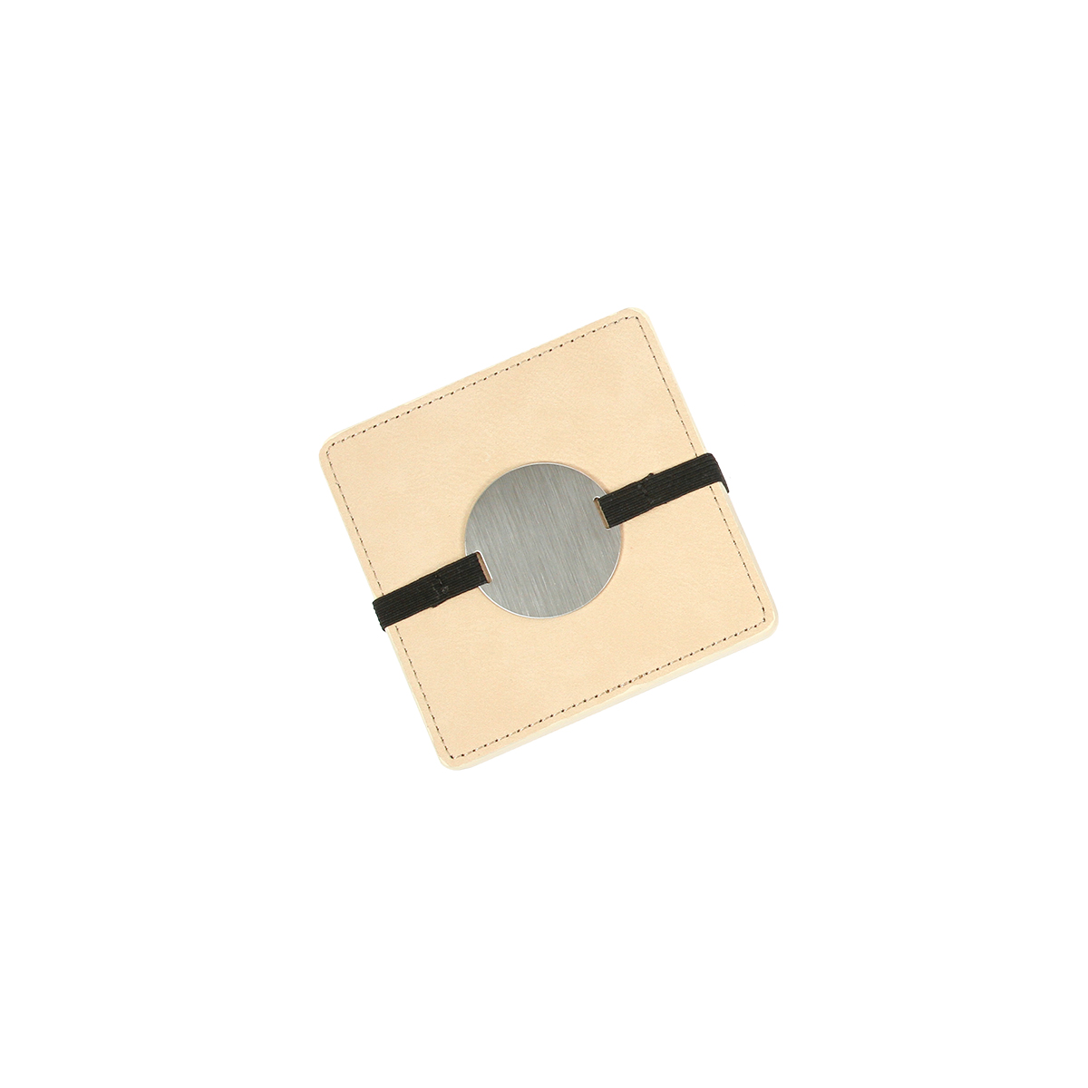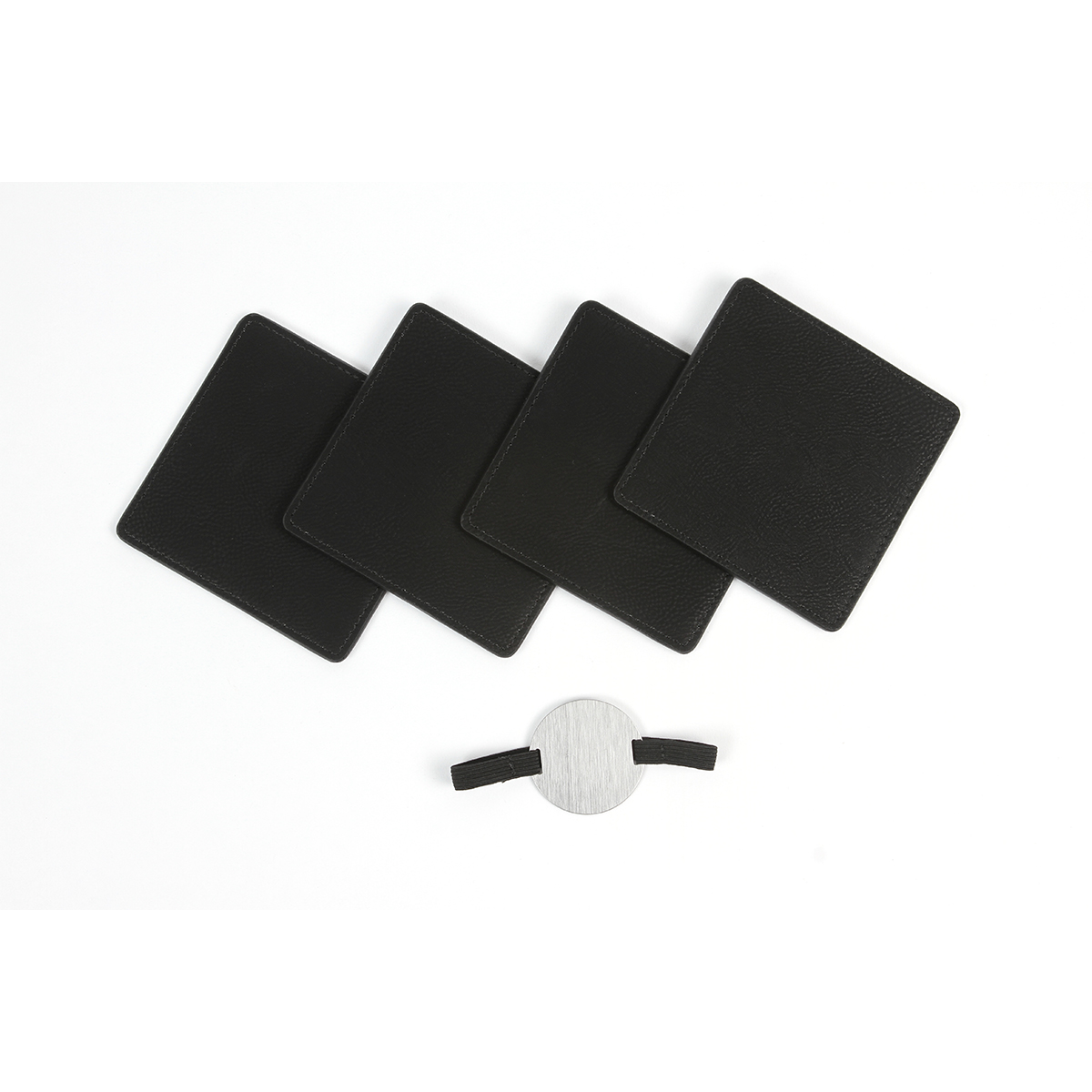 Juego de 4 piezas de porta vasos fabricado en curpiel, forma cuadrada, prácticos y elegantes, fáciles de limpiar y de guardar, ya que cuentan con una banda elástica con una placa de metal circular. Accesorios funcionales que ayudan a mantener el orden y evitar derrames en diversas superficies como escritorios, mesas o muebles del hogar. Ofrecen soporte estable para tazas, botellas y vasos, protegiendo contra manchas, humedad y ralladuras. Además, aportan un toque decorativo y práctico al espacio, siendo ideales tanto para el hogar como para oficinas.