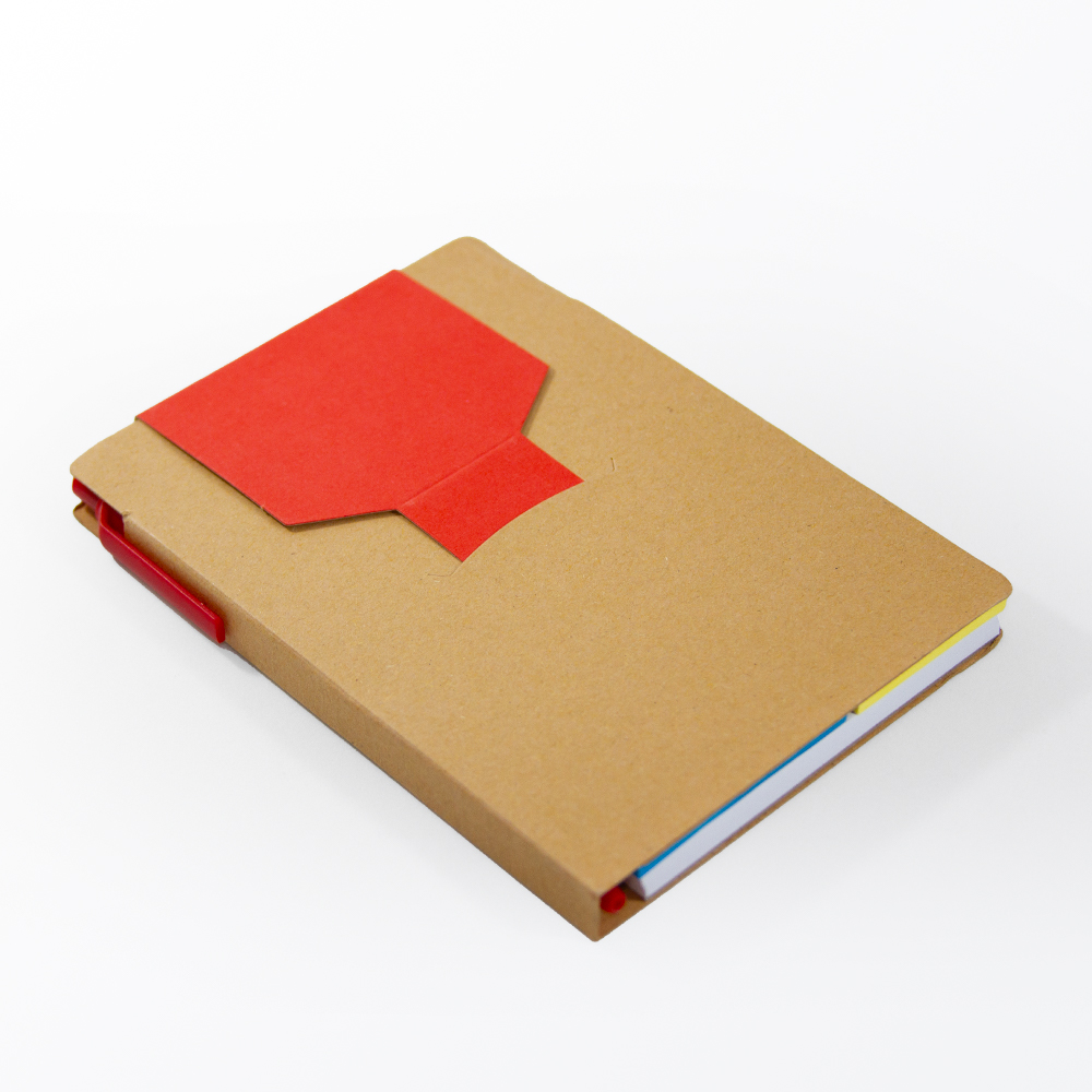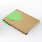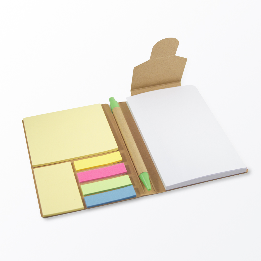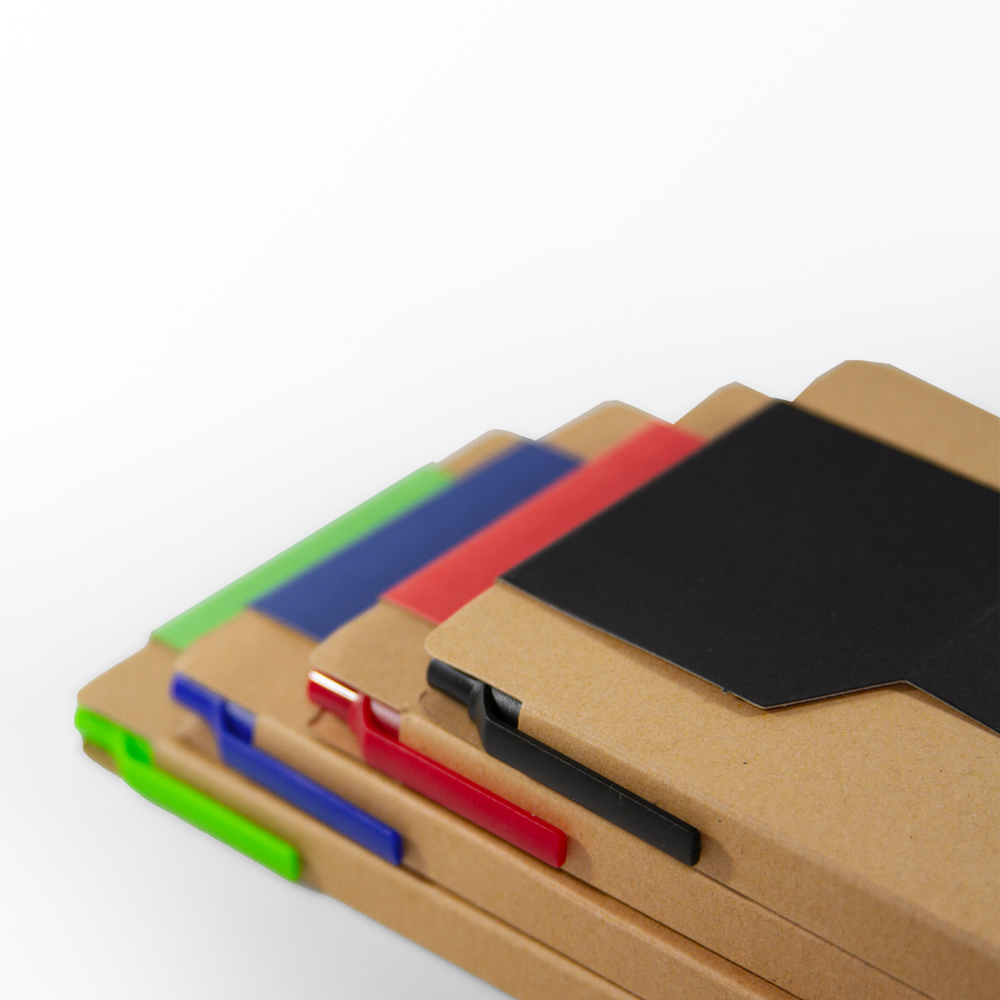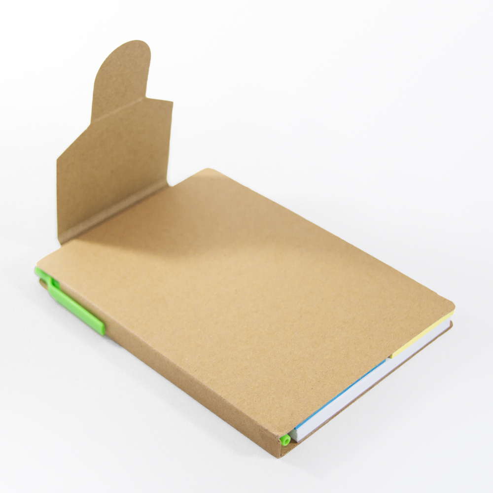 Libreta de cartón reciclado con bloc de notas de 70 hojas blancas, 2 blocs adhesivos y separadores de colores adheribles. Incluye bolígrafo ecológico con tinta negra.