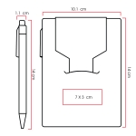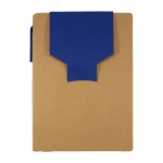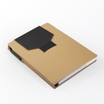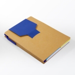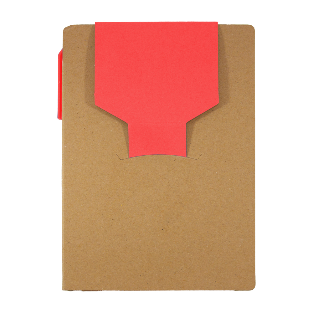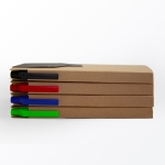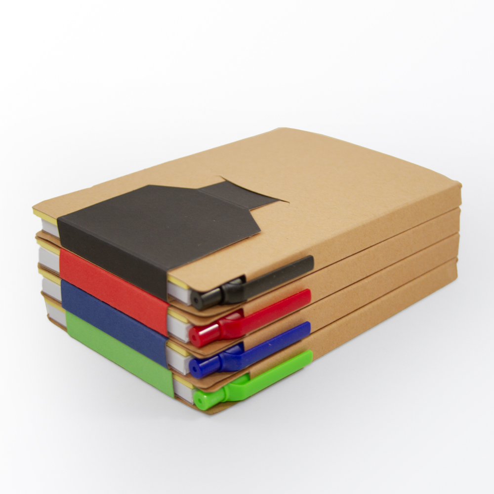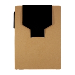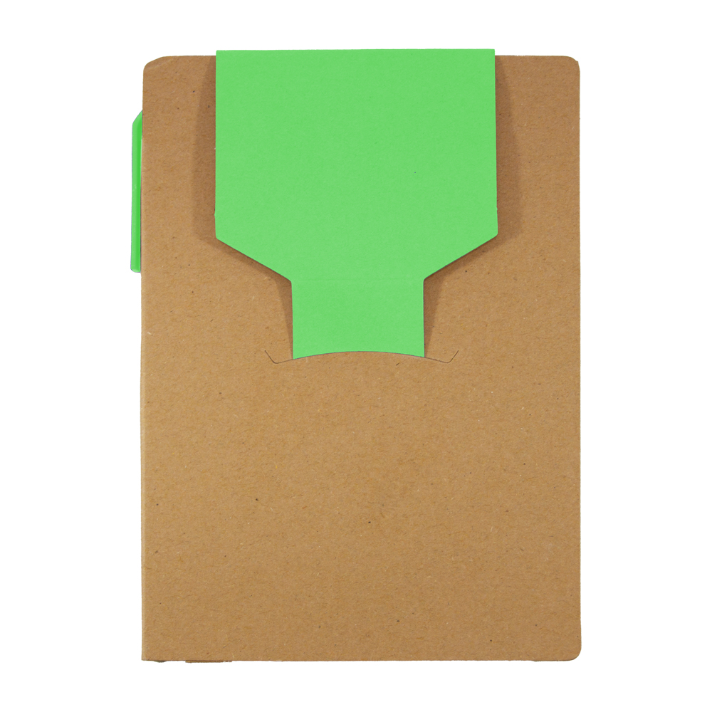 Libreta de cartón reciclado con bloc de notas de 70 hojas blancas, 2 blocs adhesivos y separadores de colores adheribles. Incluye bolígrafo ecológico con tinta negra.