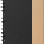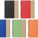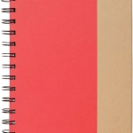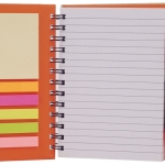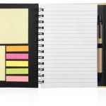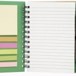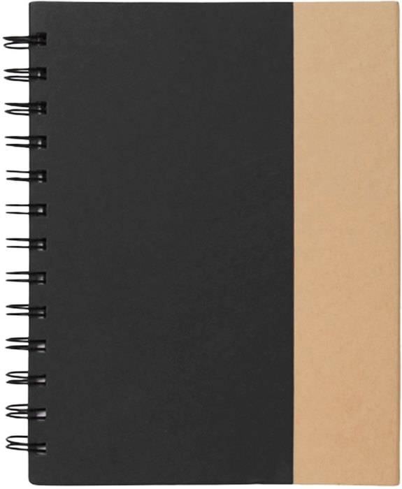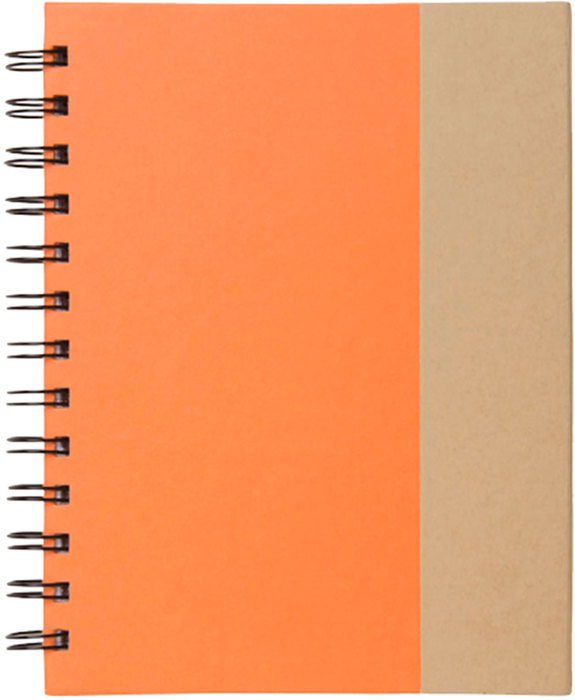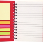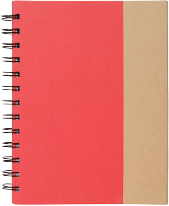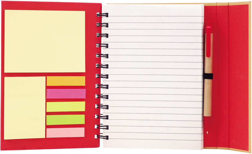 Cuaderno de cartón con espiral. Dos autoadhesivos rectangulares (grande y mediano), cinco autoadhesivos señaladores de diferente color y bolígrafo de cartón con pulsador, clip y punta plásticos de color. 70 Hojas rayadas. Cierre imantado.