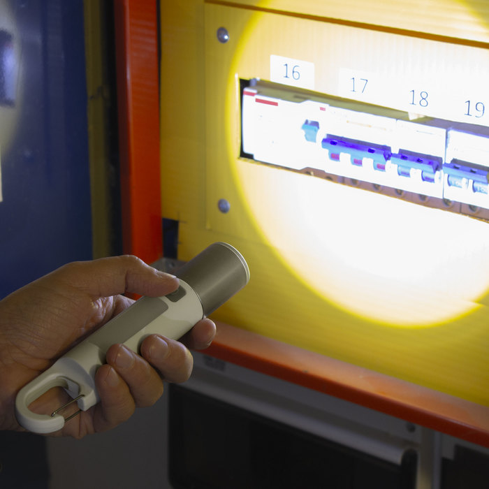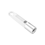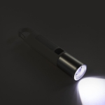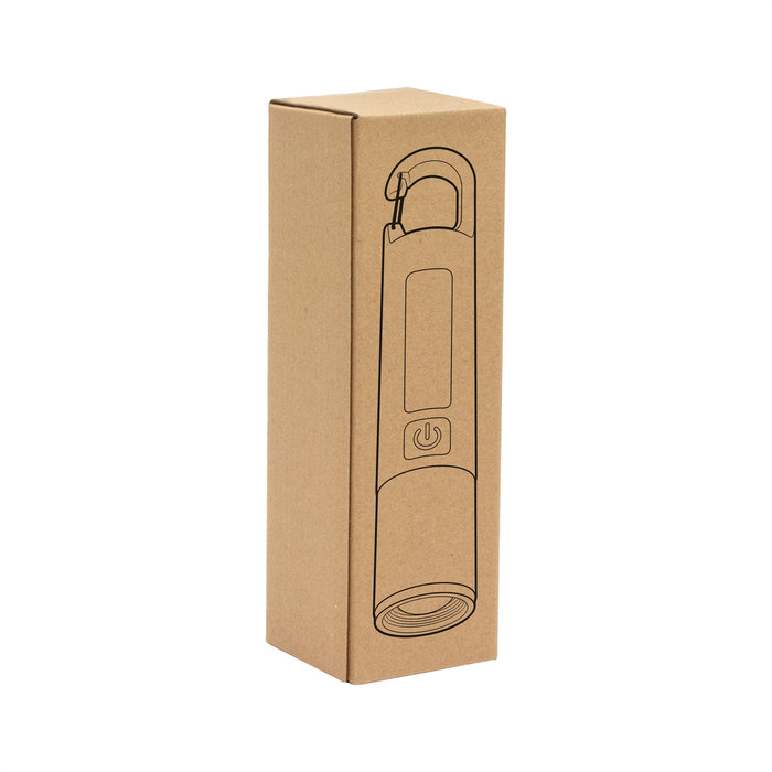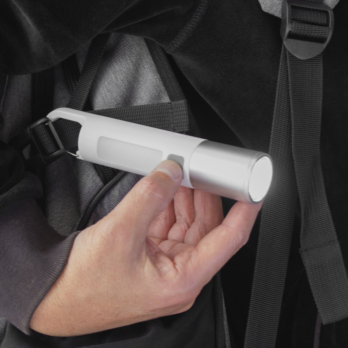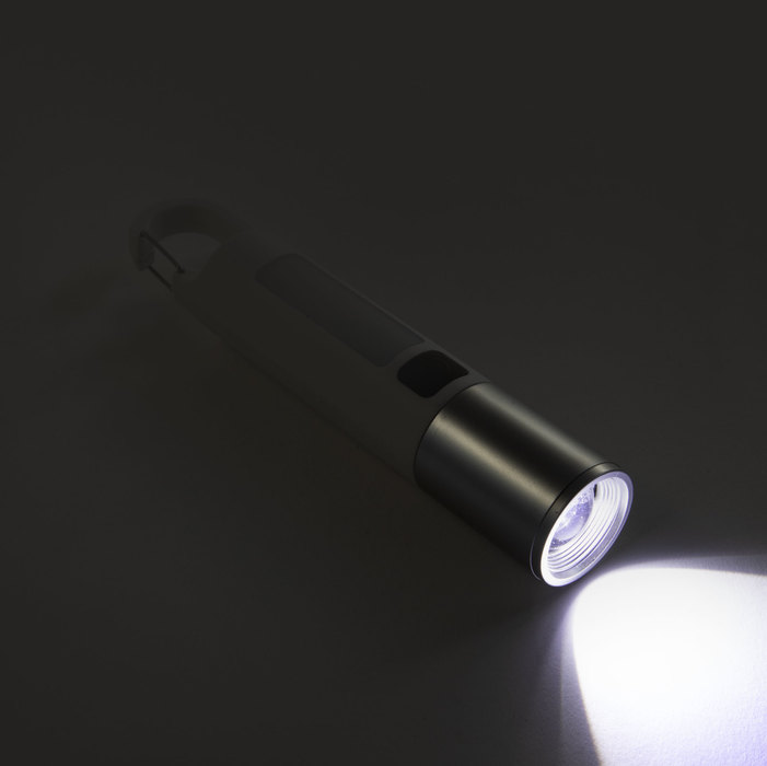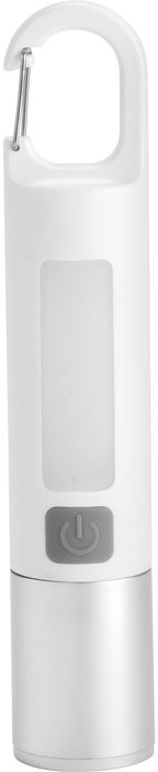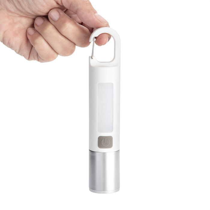 Linterna portátil recargable. Con mosquetón incorporado. Luz de emergencia y 2 intensidades de iluminación (alta e intermitente). Batería recargable 800 mAh. Fuente de luz 7 leds de alta potencia. Puerto USB-C oculto (se desplaza el cuerpo hacia arriba). Cable de carga color blanco.